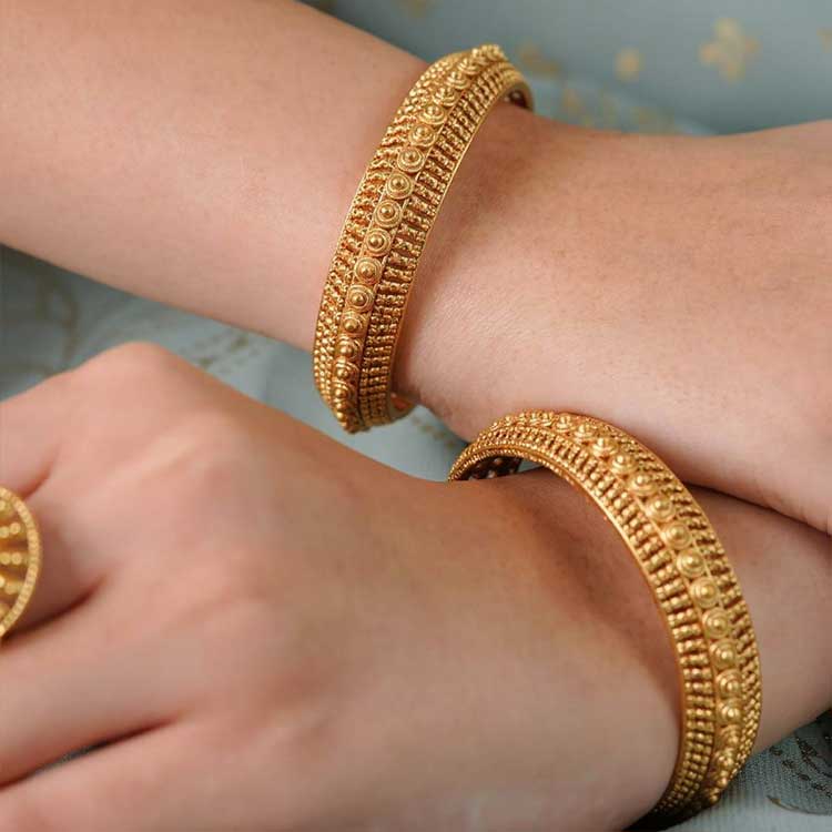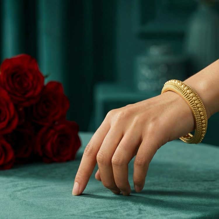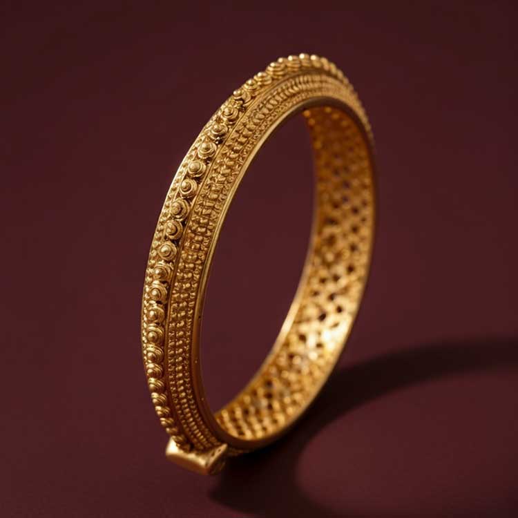 Sleek and timeless, this gold-toned bangle features finely textured detailing with a classic, traditional finish. Designed to shine with subtle elegance, it’s perfect for layering or wearing solo at festive and everyday occasions. Graceful, minimal, and effortlessly sophisticated.