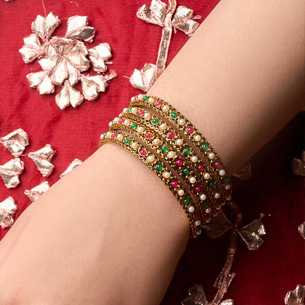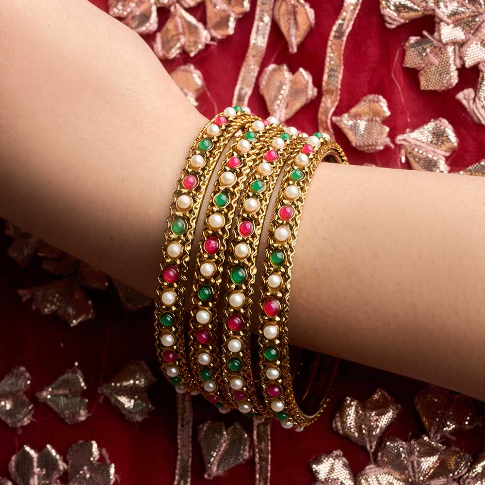 This striking collection of four hefty, gold-colored bangles with white, red, and green beading is a great way to honor heritage. These bangles combine contemporary craftsmanship with cultural charm.