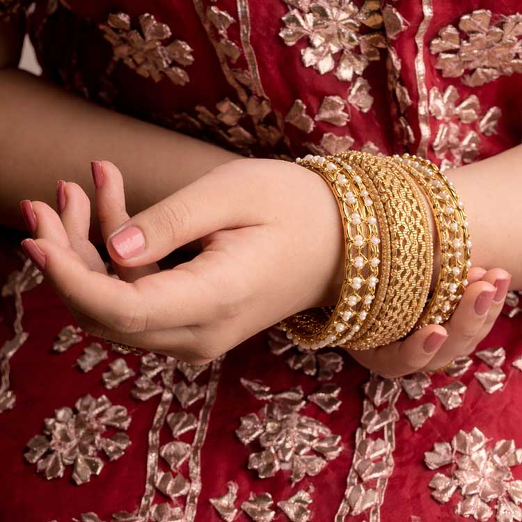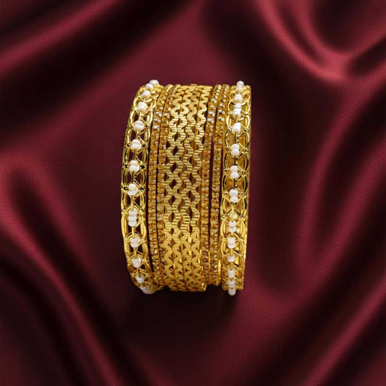 Richly crafted gold-tone bangles featuring ornate textures and rows of sparkling stone accents. Their classic, layered design adds timeless elegance, making them perfect for weddings and festive occasions.