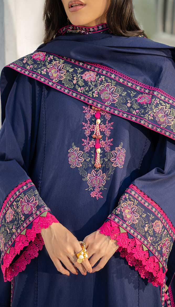 Add charm to your winter look, a deep blue three-piece khaddar set detailed with tassels on neckline and floral multihead embroidery accents. Paired with straight trouser pants and a matching dupatta, it brings together comfort and sophistication for effortless everyday elegance.