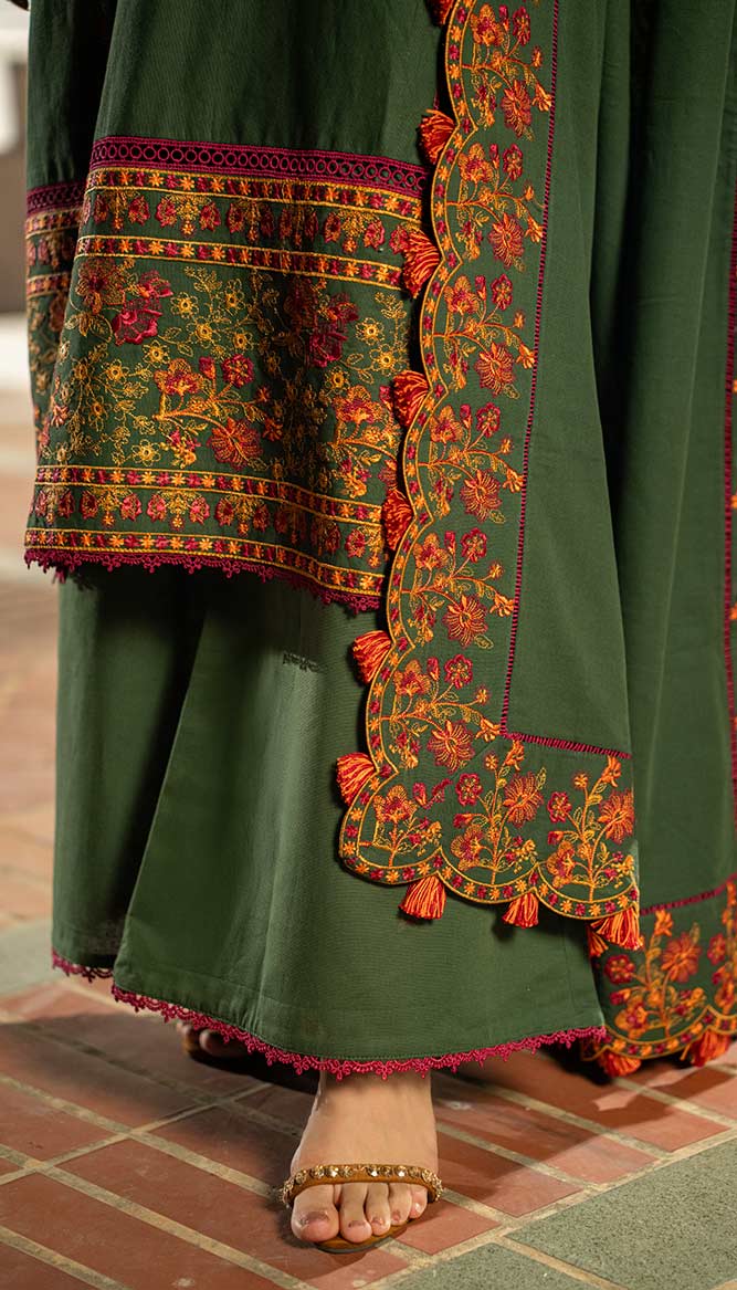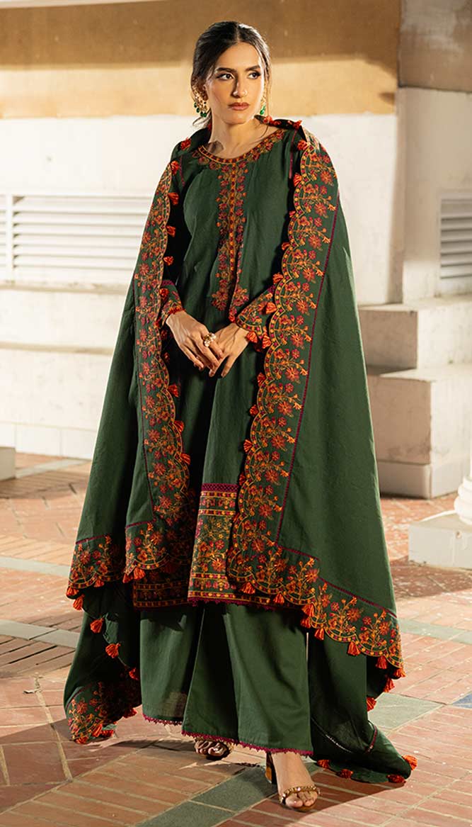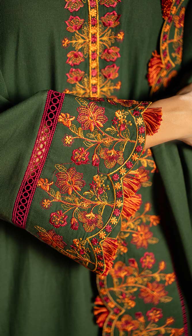 A striking three-piece khaddar ensemble in bold bottle green, paired with culottes for a modern yet traditional touch. The shirt features intricate multihead embroidery, while tassels on the scalloped dupatta style and sleeves lend a graceful, playful accent. A vibrant outfit, ideal for festive gatherings and seasonal celebrations.