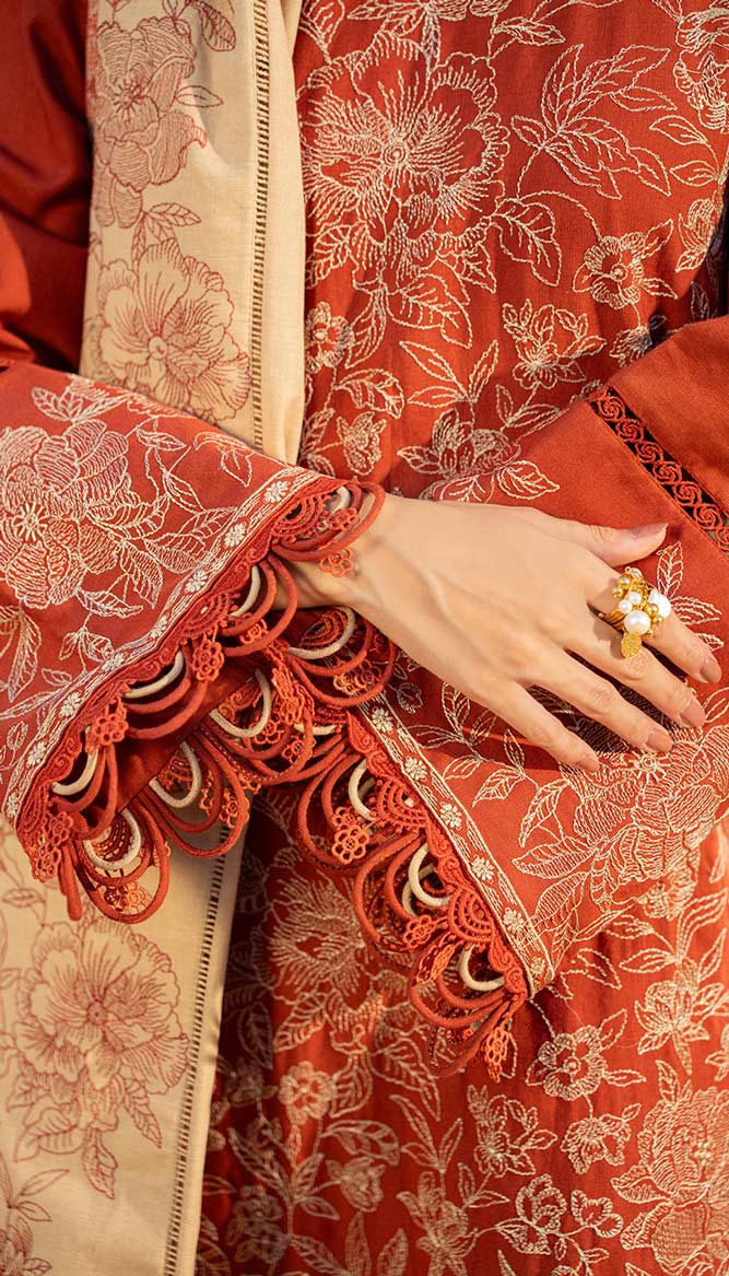 A graceful three-piece khaddar ensemble in deep rust and soft skin tones. The shirt and culotte are paired with a delicately detailed dupatta, finished with corner tassels for a subtle traditional touch. A perfect balance of earthy warmth and refined elegance, ideal for seasonal wear.