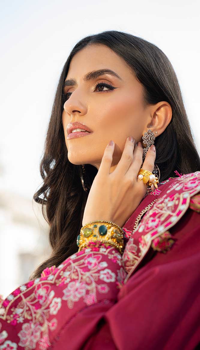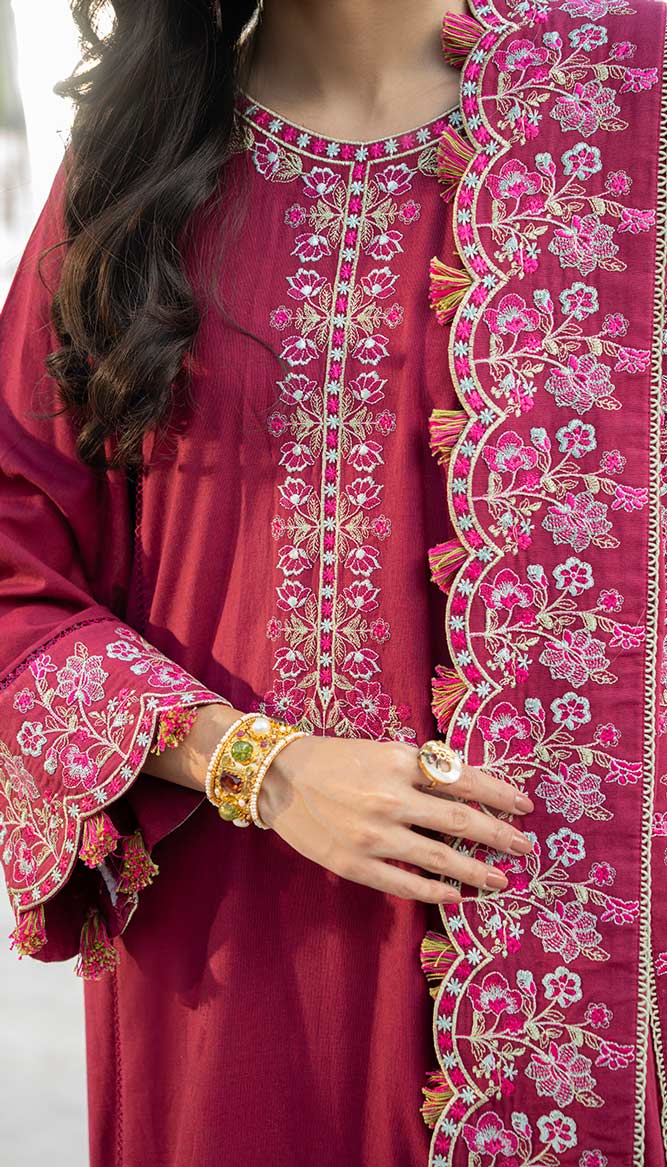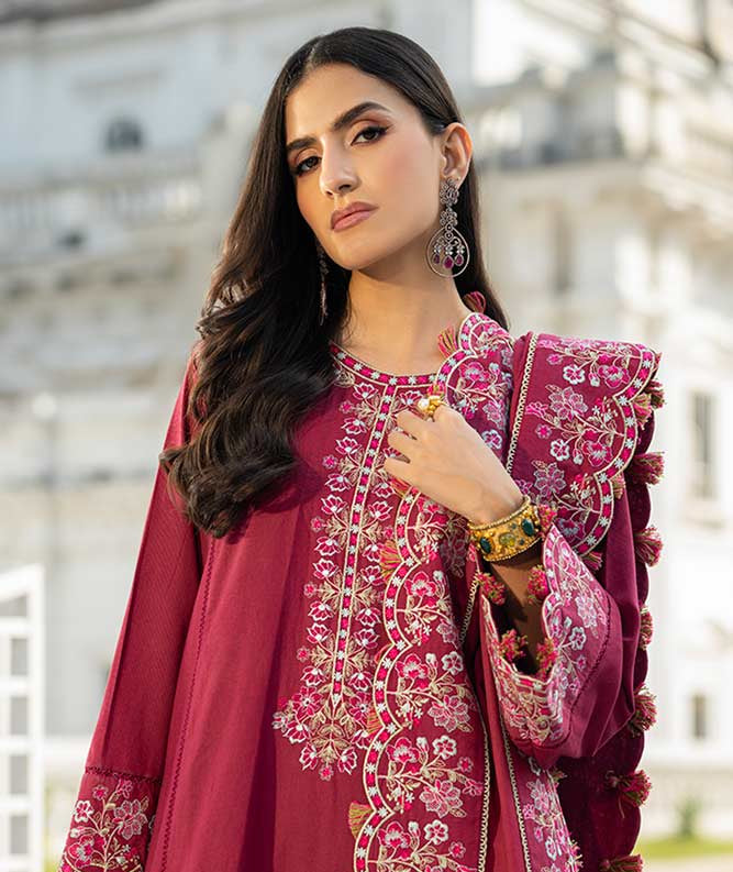 A vibrant three-piece khaddar set in striking hot pink, designed with culottes for a chic yet traditional look. The shirt is adorned with delicate multihead embroidery, complemented by tassels on the scalloped dupatta style and sleeves, adding a playful charm. A lively statement piece, perfect for festive and seasonal wear.