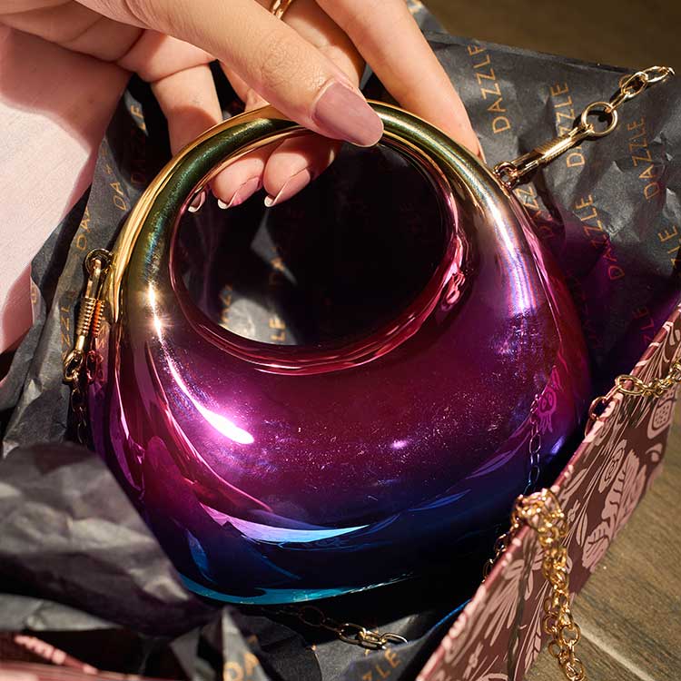 A modern acrylic clutch designed with a sleek, rounded silhouette and a glossy finish. Its smooth shine gives it a luxe, contemporary feel, while the chain adds both elegance and ease of carrying. A perfect accessory to elevate any evening look.