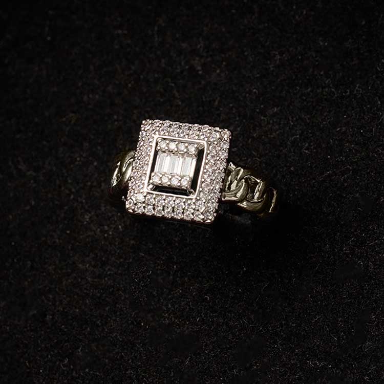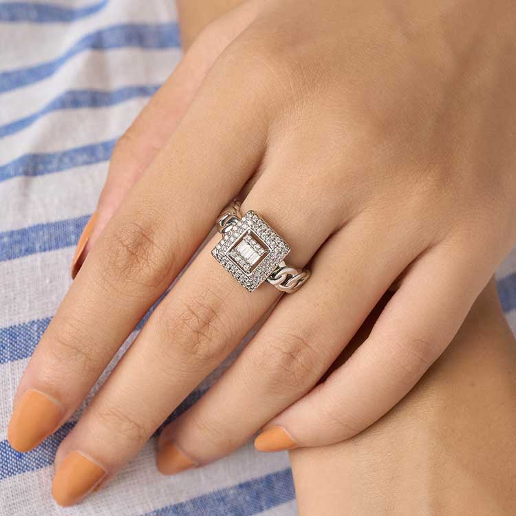 Tiny square beads that catch the light brilliantly adorn this silver-colored ring, adding a hint of structure and sparkle. It’s distinctive geometry gives your regular stack a contemporary touch.
