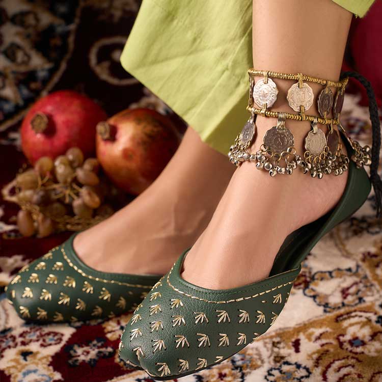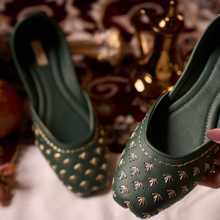 With our “Bayza” Khussa, you can enter a peaceful state. A novel twist on conventional footwear is provided by the delicate laser-cut patterns and the calming green hue. This khussa, which is handcrafted from supple leather, guarantees comfort while giving your outfit a dash of elegance inspired by nature.