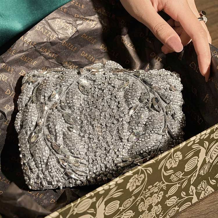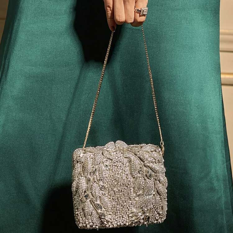 Exquisite and enchanting, this crystal-embellished clutch is adorned with intricate leaf motifs and shimmering stones that create a truly regal look. Designed to sparkle with every movement, it’s the perfect accessory for weddings, receptions, and grand celebrations. Elegant, luxurious, and breathtakingly radiant.