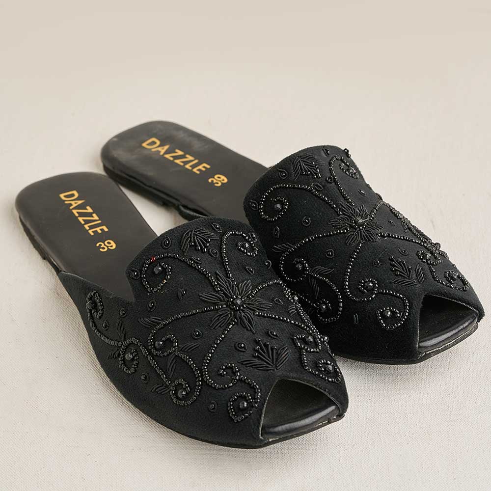 “Hana” a vision of timeless elegance in black. This beautifully crafted peep toe mule features intricate bead and thread work that adds a subtle sparkle to every step. Perfect for elevating both formal and festive looks with effortless grace.