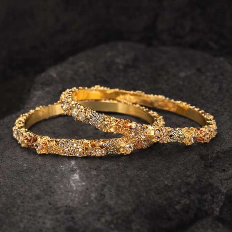 Luxurious and intricately crafted, these gold-toned bangles feature ornate detailing with shimmering stones and delicate embellishments for a regal finish. Designed to catch the light beautifully, they add grandeur and elegance to bridal and festive looks. Bold, radiant, and timelessly stunning.