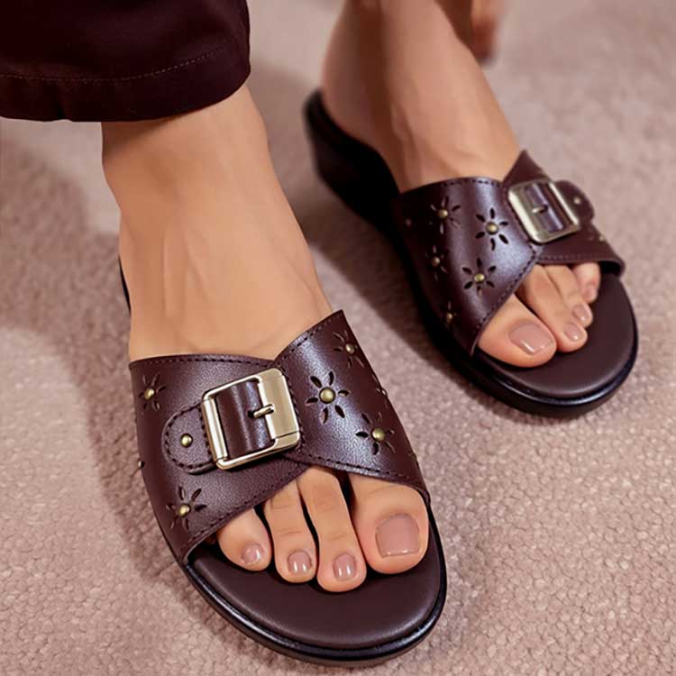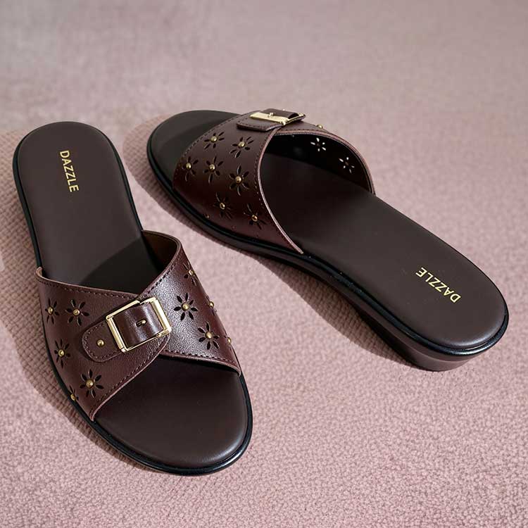 Smart and stylish, this dark brown slip-on sandal features a sleek strap accented with a chic buckle and subtle stud detailing. Designed for comfort with a polished everyday look, it’s perfect for casual outings and effortless styling. Minimal, modern, and easy to wear.