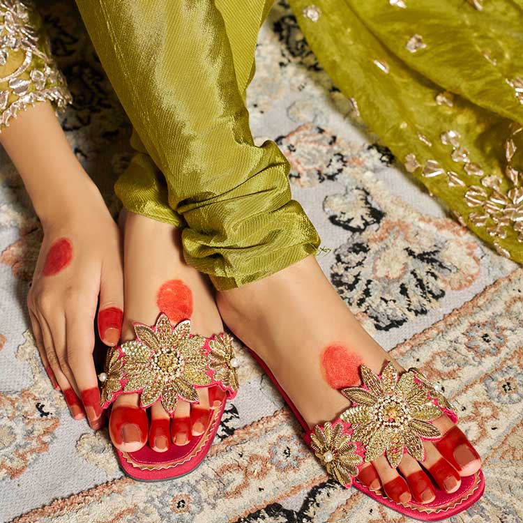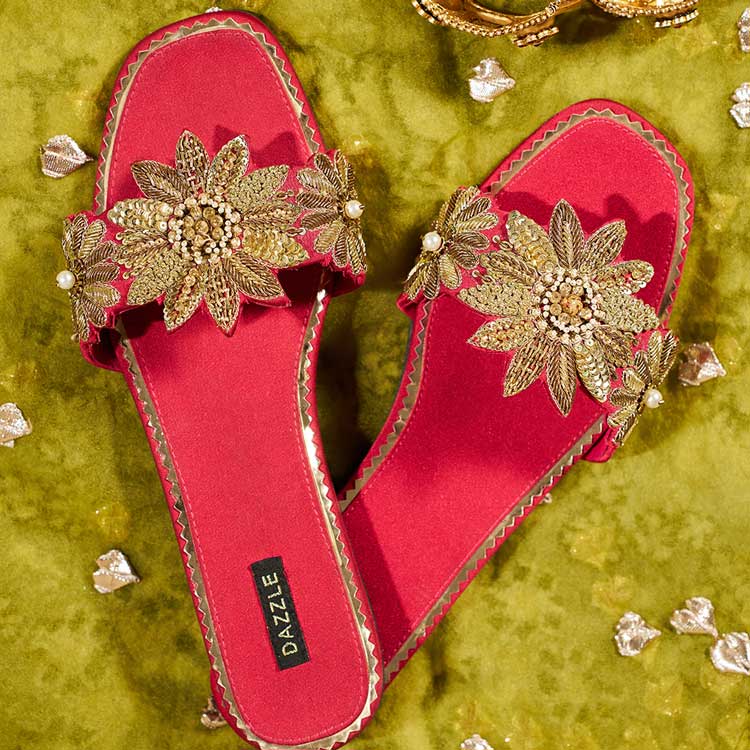 The Raqs slider comes in a vibrant hot pink shade, highlighted with intricate floral handwork on the strap for a striking look. Handcrafted with care, it combines traditional elegance with a bold, modern touch. Perfect for festive occasions or special gatherings.