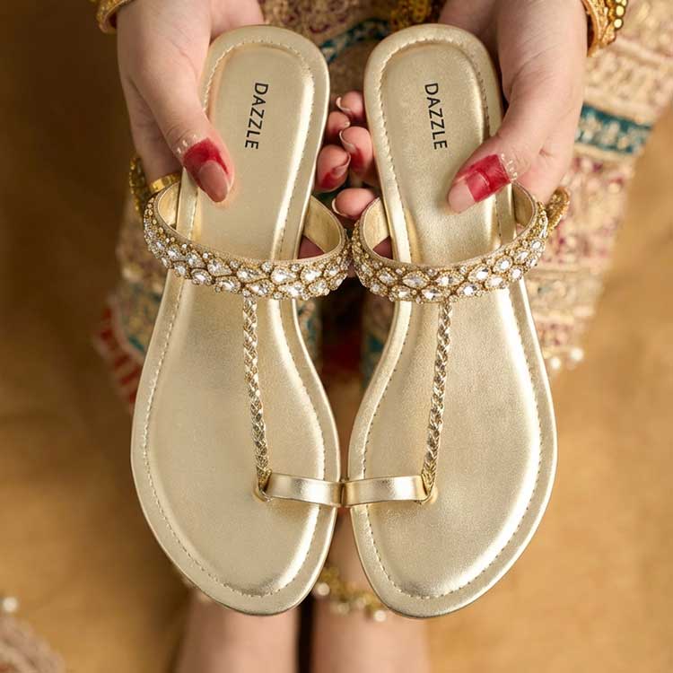 Chic gold-tone Kolhapuri-style sandals featuring delicate chain detailing and subtle crystal accents. Elegant yet comfortable, these flats add a modern festive touch to both ethnic and fusion outfits.