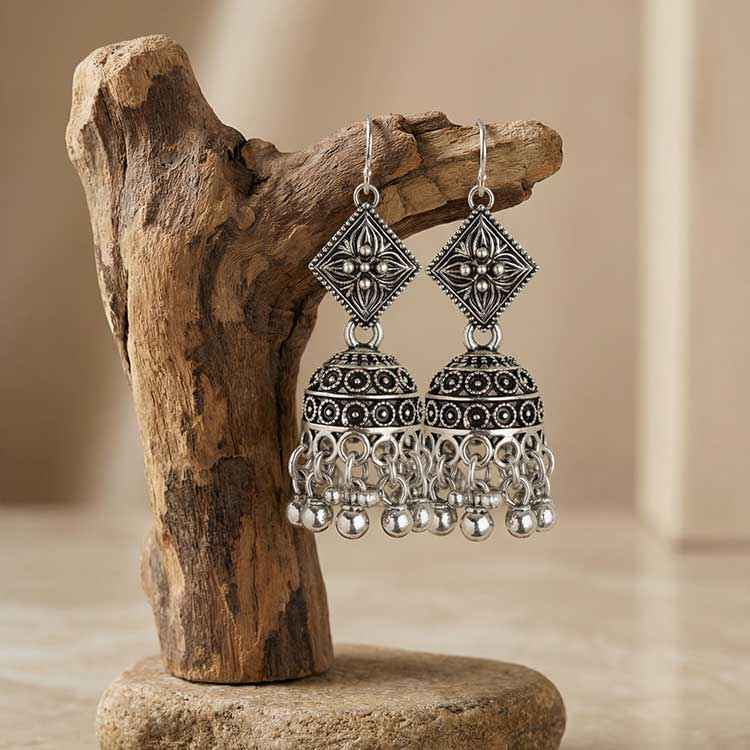 Bold and artistic, these silver earrings feature intricately carved geometric studs paired with detailed jhumka drops and tiny dangling charms. Designed to sway with graceful movement, they add a striking fusion of tradition and contemporary flair. Perfect for festive looks, cultural wear, and statement styling.
