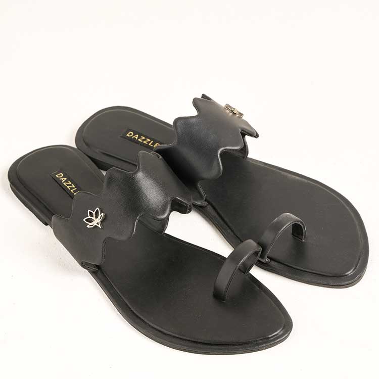 “Curl (Black)” gives your feet a fiercely elegant look. With its striking Scallop strap and all-black design, these shoes are essential for accessorizing modern ethnic or monochromatic ensembles.