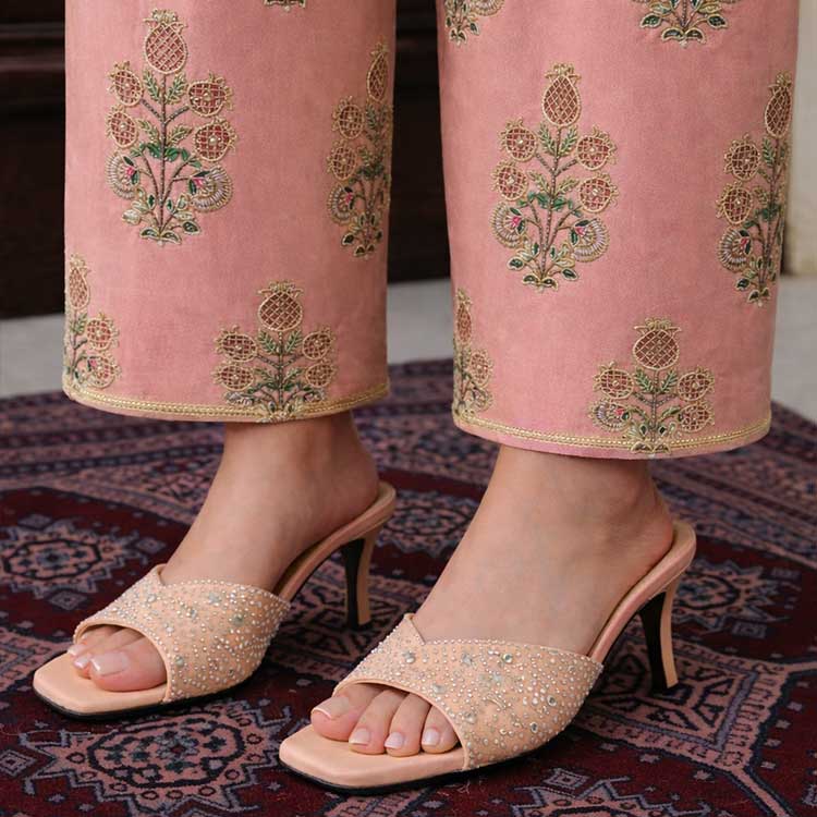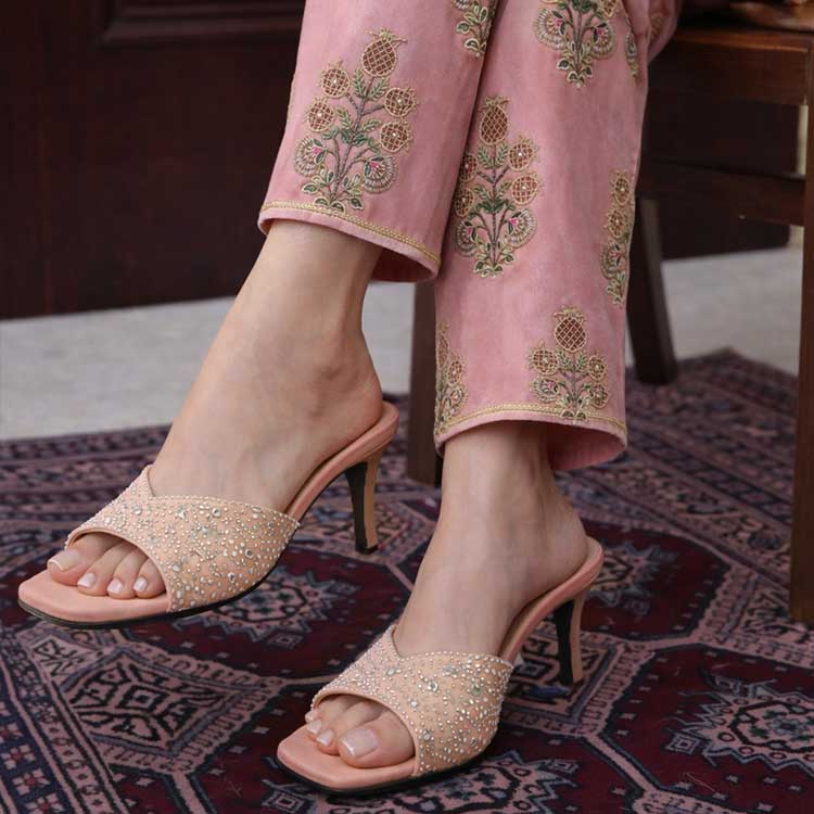 Step into understated glamour with this stylish heel, designed in a warm peach tone. The strap is embellished with delicate crystals, adding a subtle sparkle to every step. Finished with a sleek heel and cushioned footbed, it’s the perfect blend of comfort and elegance, ideal for dinners, festive outings.