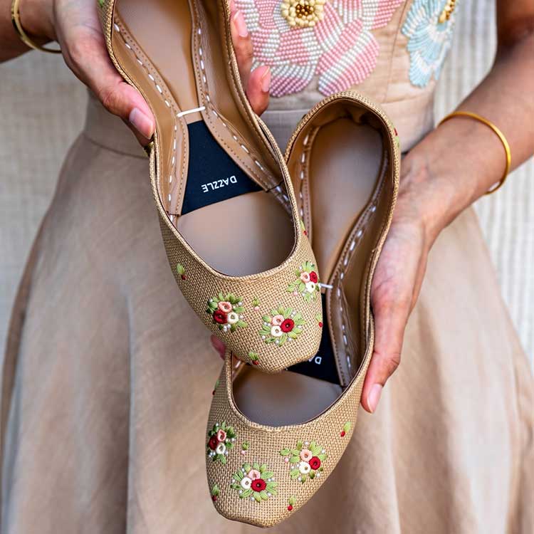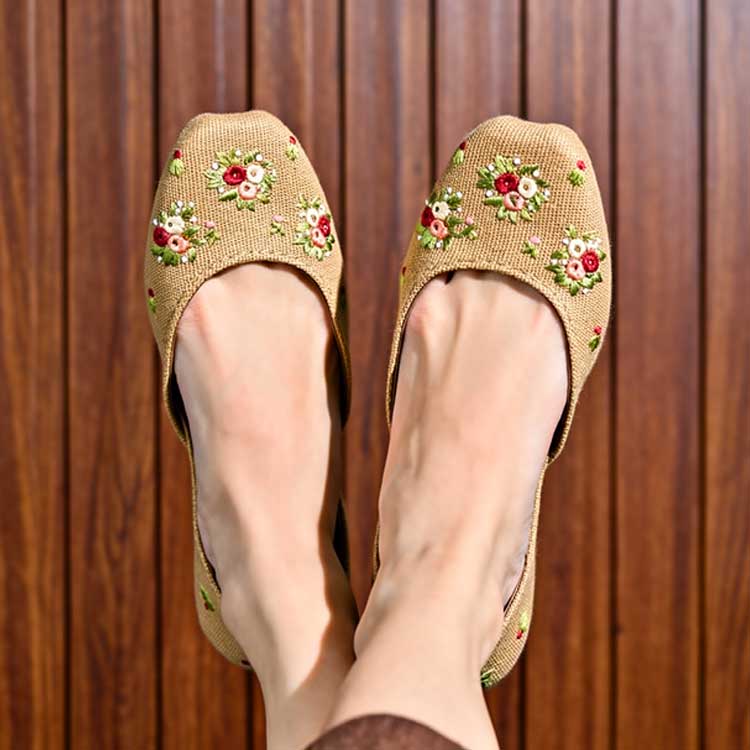 A soft beige khussa adorned with dainty floral embroidery in earthy tones, blending grace with detail. Designed with cushioned comfort and a classic handcrafted silhouette, it’s a versatile pick for festive wear, casual elegance, and everyday charm.