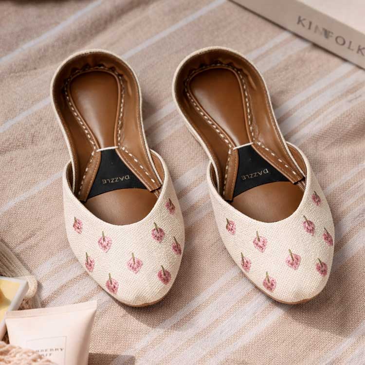 A charming khussa “Whispa” crafted in a neutral white base, beautifully detailed with dainty pink tone embroidered motifs. Its soft inner padding and classic silhouette offer comfort with cultural flair. Perfect for everyday wear or festive styling.