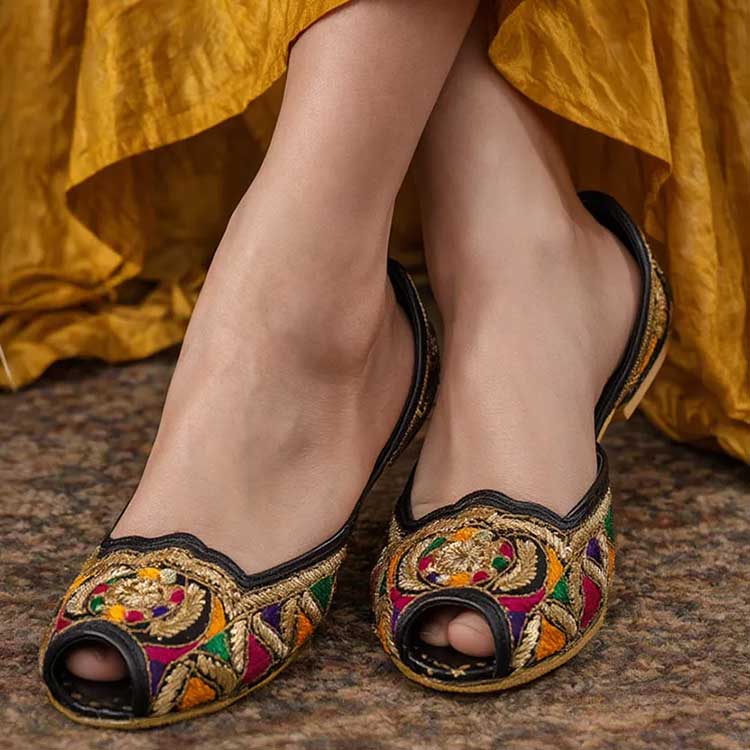 “Zarqand”, a striking handcrafted khussa featuring bold multicolor embroidery highlighted with golden work. Designed with a classic silhouette and cushioned comfort, it brings cultural artistry and modern flair together. A standout pick for festive looks, weddings, and statement everyday styling.