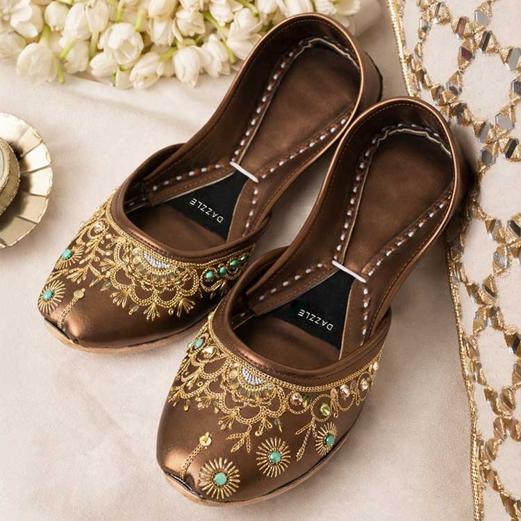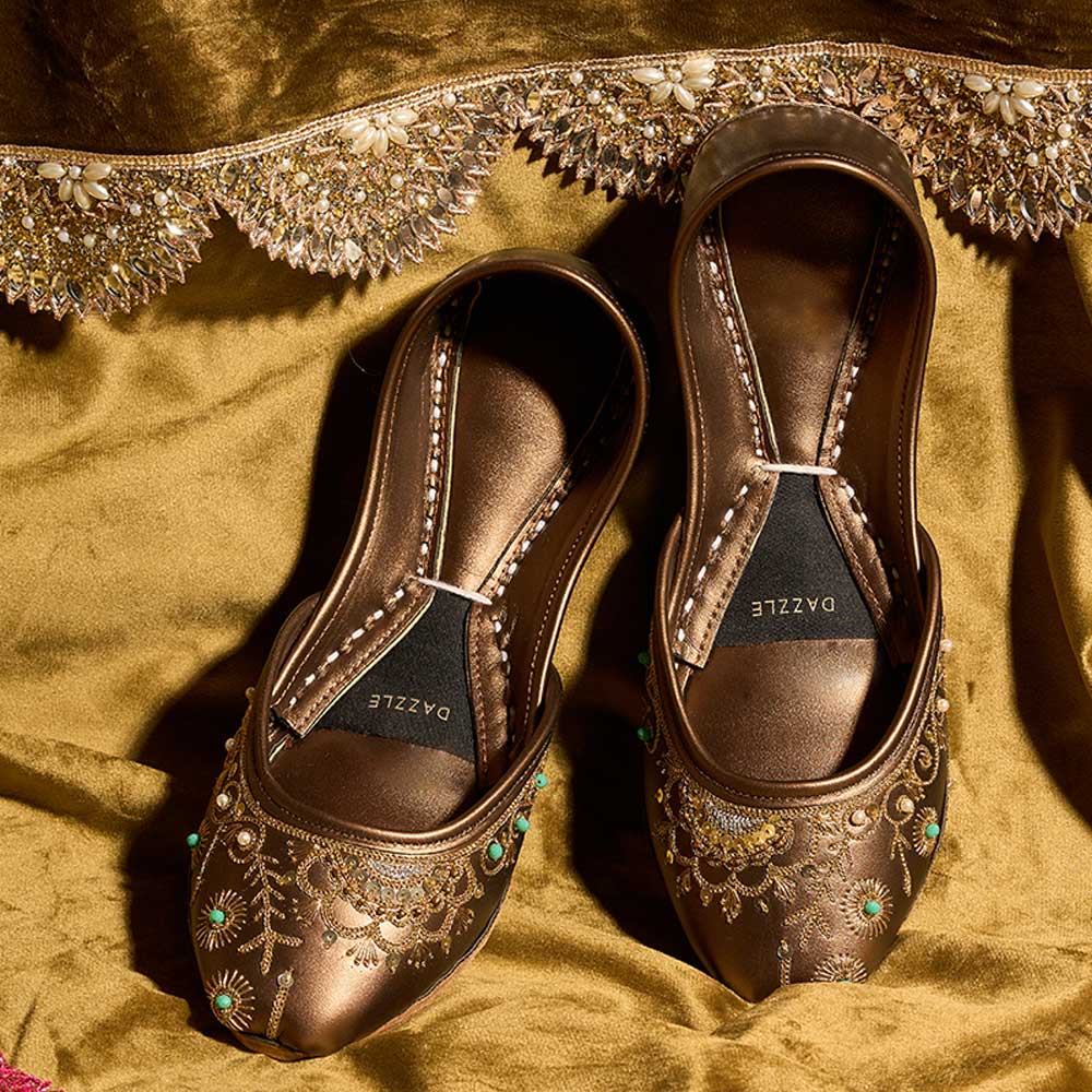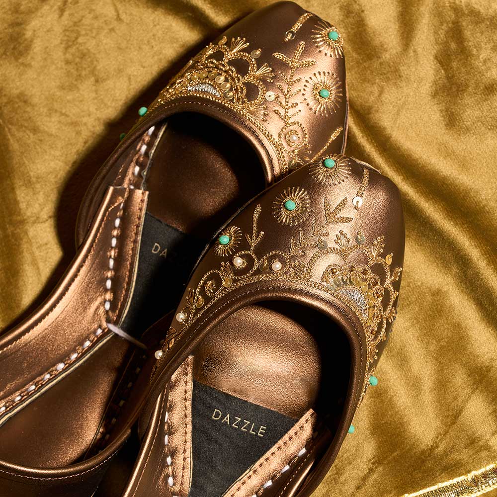 “Zarwasha” brings a regal touch with its rich copper tone, elevated by intricate golden embroidery and subtle turquoise accents. Soft, comfortable, and artfully detailed, it’s the perfect pair to add festive glow to any traditional look.