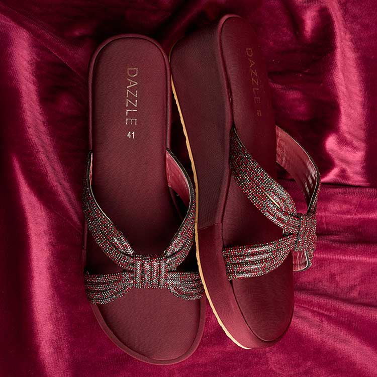 Step into elevated comfort with these maroon platform slides, featuring criss-cross beaded straps that add instant glam to your look. The cushioned wedge sole offers height without compromising ease, making them perfect for long outings. A bold blend of sparkle, style, and all-day comfort.