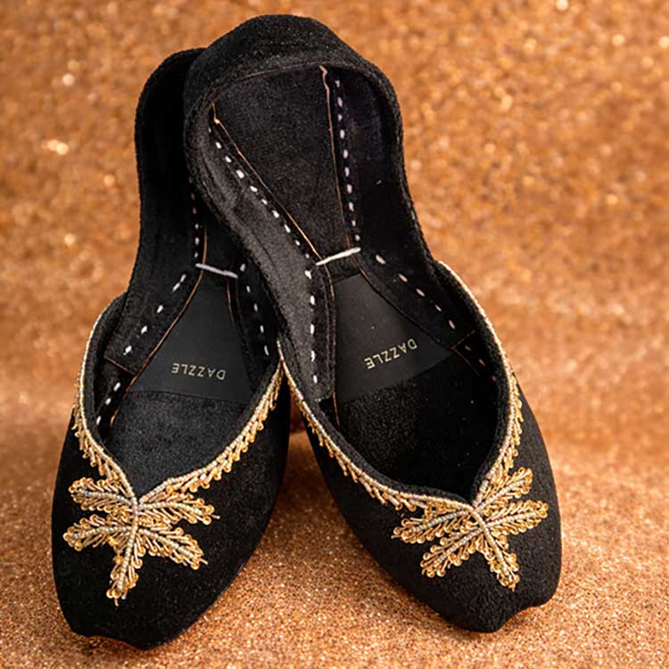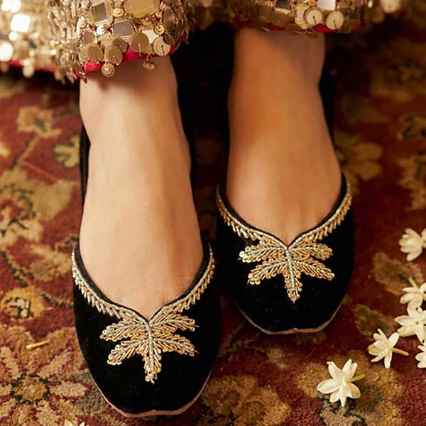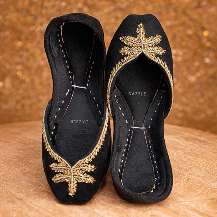 Striking and regal, these black khussas are adorned with bold gold leaf embroidery that adds a touch of royal elegance. Designed to stand out while offering all-day comfort, they’re perfect for festive occasions, evening wear, and statement ethnic looks. Bold, refined, and effortlessly majestic.
