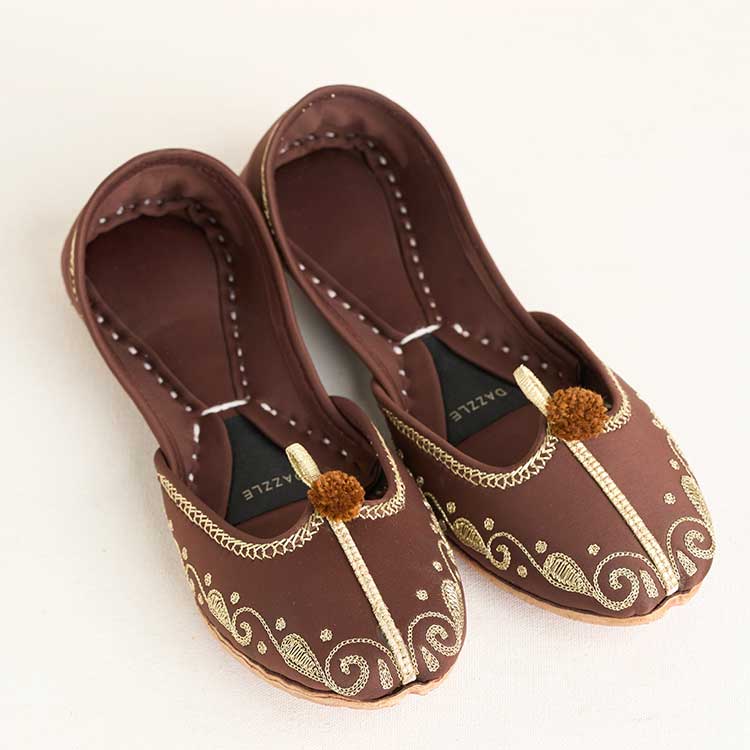 Husnaaz features elegant upper detailing with fine golden embroidery and delicate swirl patterns. Finished with a charming pom-pom on the front, it adds a playful traditional touch.