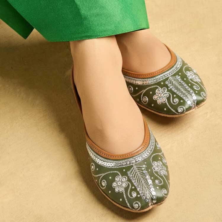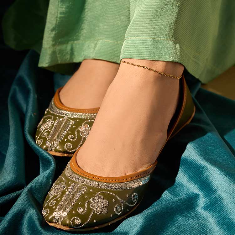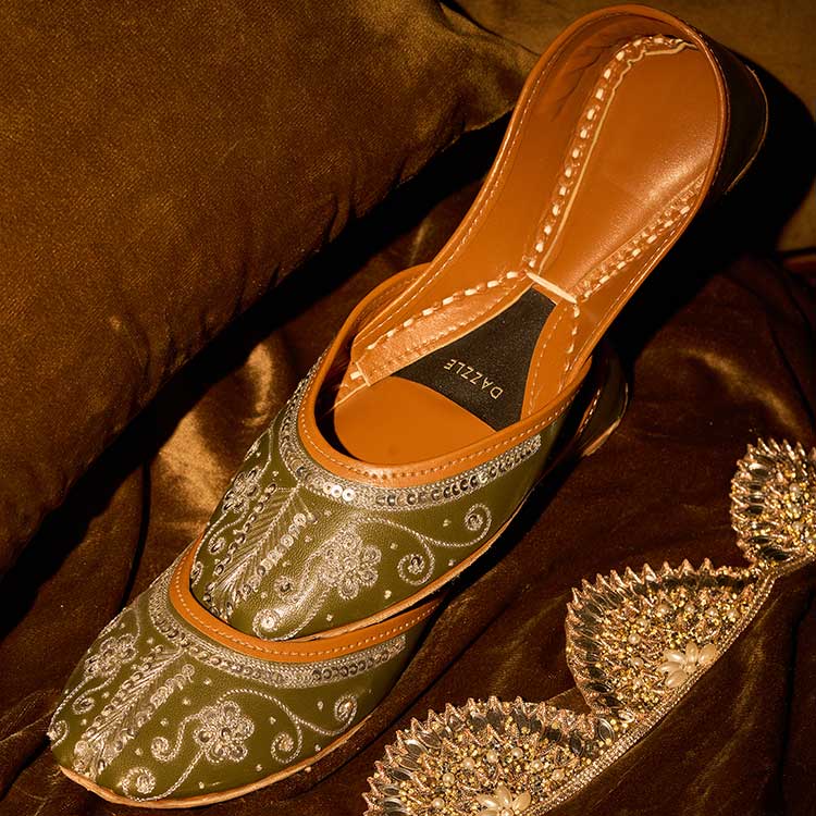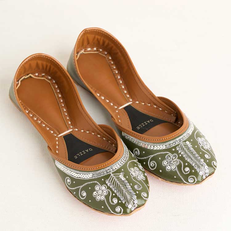 Rosheen features a rich olive-green base beautifully adorned with delicate silver tilla work. The floral and swirl patterns bring a graceful shimmer to every step. Its detailed upper design makes it perfect for festive and formal looks.