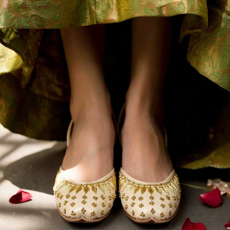 “Armeena” features a beautifully crafted upper adorned with delicate golden bead detailing and fine leaf-shaped embroidery. The neat handwork creates a graceful pattern that adds a soft festive charm. Its elegant finish makes it perfect for both formal and traditional wear.