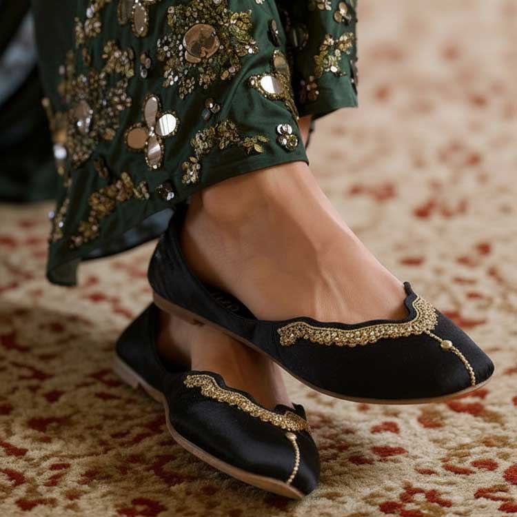 Sleek and timeless, this black khussa is beautifully finished with delicate gold scalloped detailing for a touch of understated luxury. Designed for comfort and effortless elegance, it’s perfect for festive wear, evenings, and classic ethnic styling. Simple, graceful, and forever in style.
