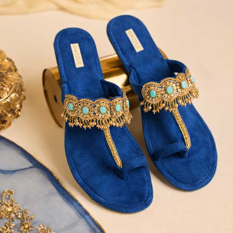 The Maina kolhapuri features a deep navy blue base, adorned with fine handwork, intricate embellishments, and elegant tassels for a rich, artistic look. Handcrafted with attention to detail, it brings together tradition and contemporary elegance. Perfect for weddings and festive occasions.