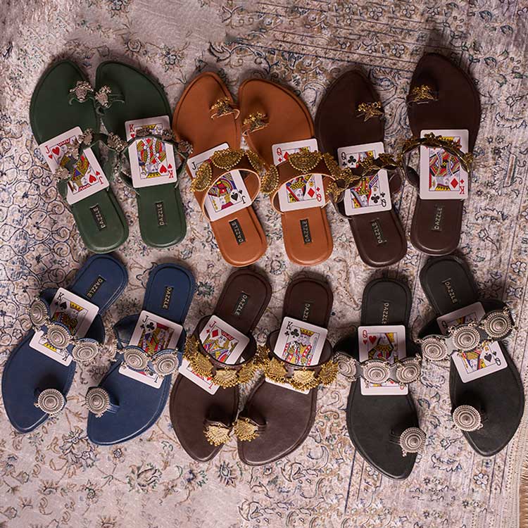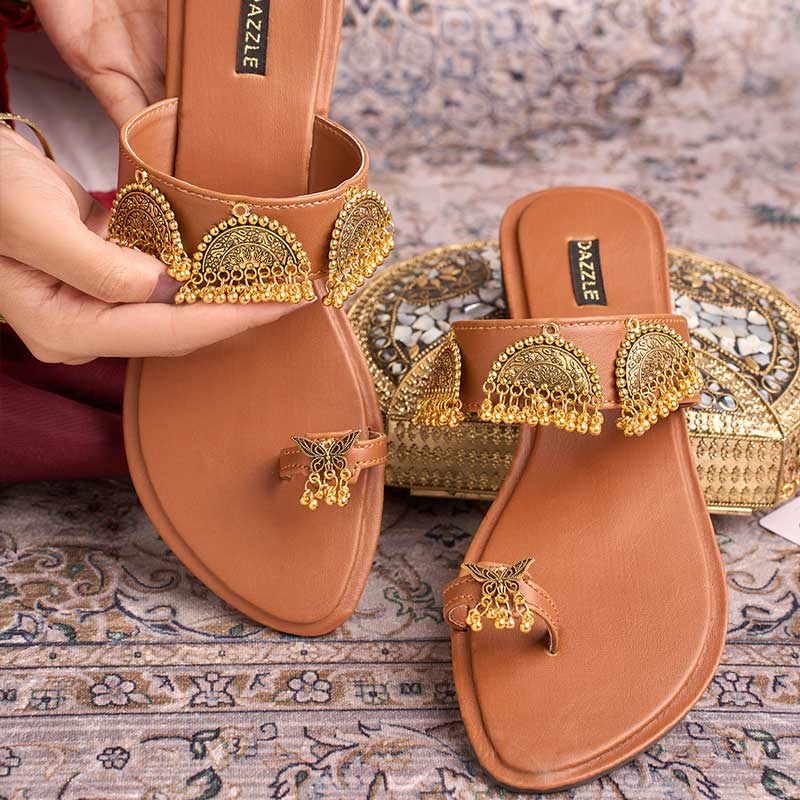Inspired by our most loved ornaments khussas, we bring you now our Kolhapuri edition, with the elaborate D-shape metal ornaments with the tint of butterfly on thumb. They are a unique addition to your summer wardrobe collection because of its rich color and soft, cushioned sole, which provides comfort. and distinct appeal.