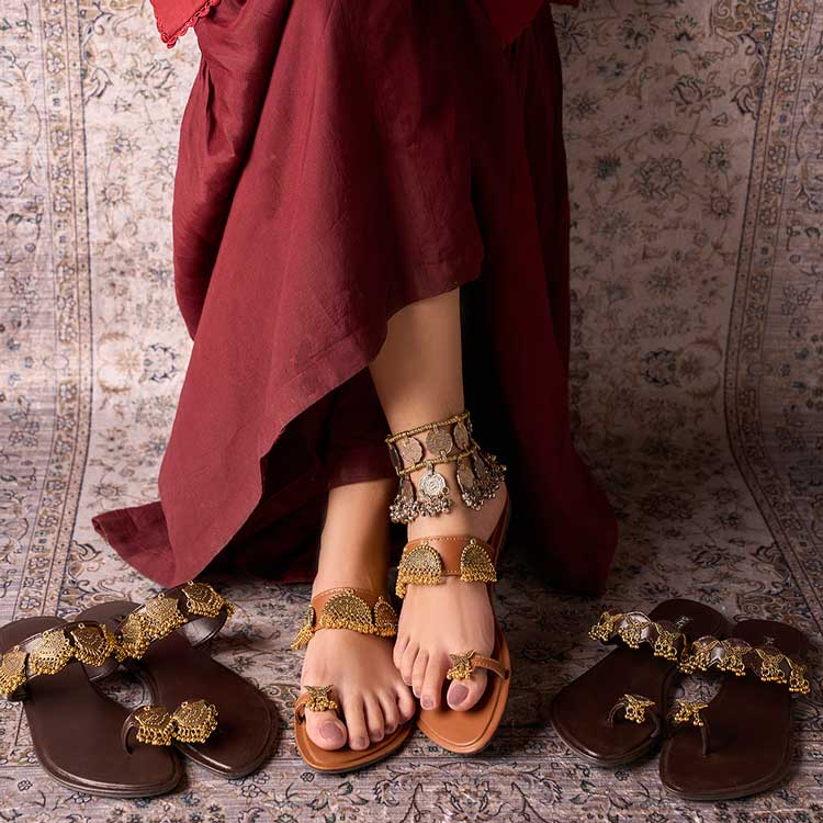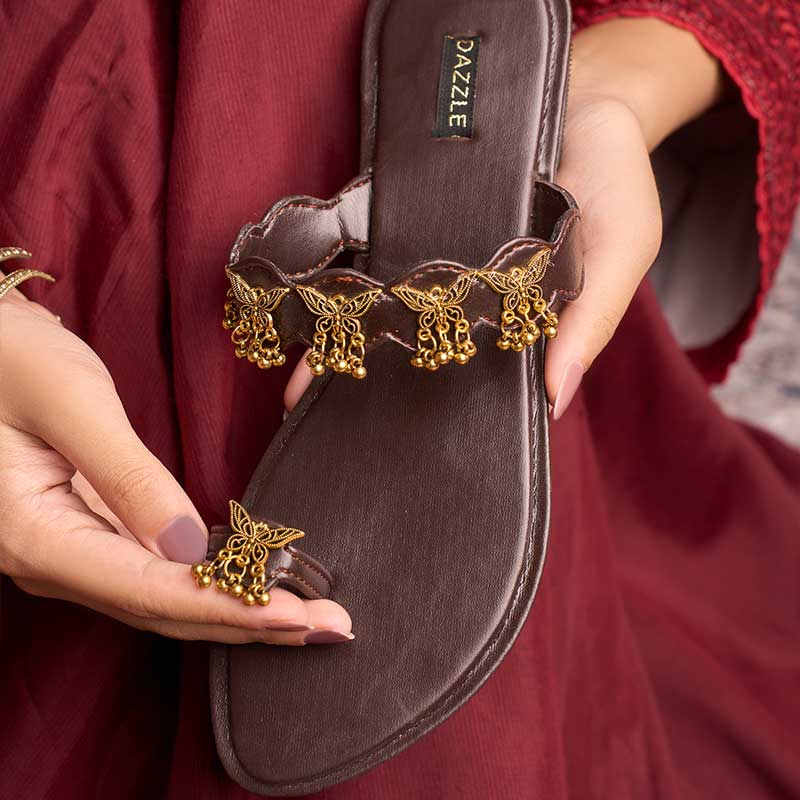 Inspired by our most loved ornaments khussas, we bring you now our Kolhapuri edition, with the elaborate butterfly metal ornaments along with dangling small hangings. They are a unique addition to your summer wardrobe collection because of its rich color and soft, cushioned sole, which provides comfort. and distinct appeal.