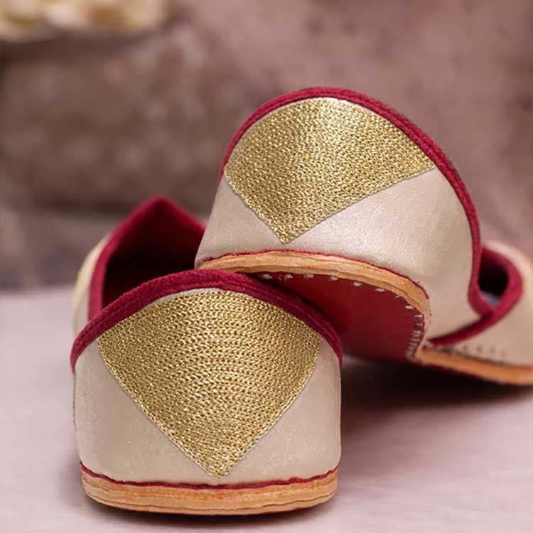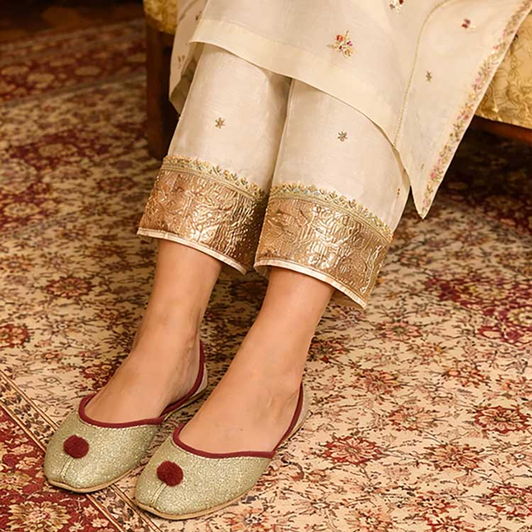 Playful yet elegant, these gold-tilla khussas feature a rich contrast lining and charming pom-pom detail for a touch of whimsy. Designed to blend comfort with festive flair, they’re perfect for celebrations, cultural wear, and stand out styling. Unique, vibrant, and delightfully eye-catching.