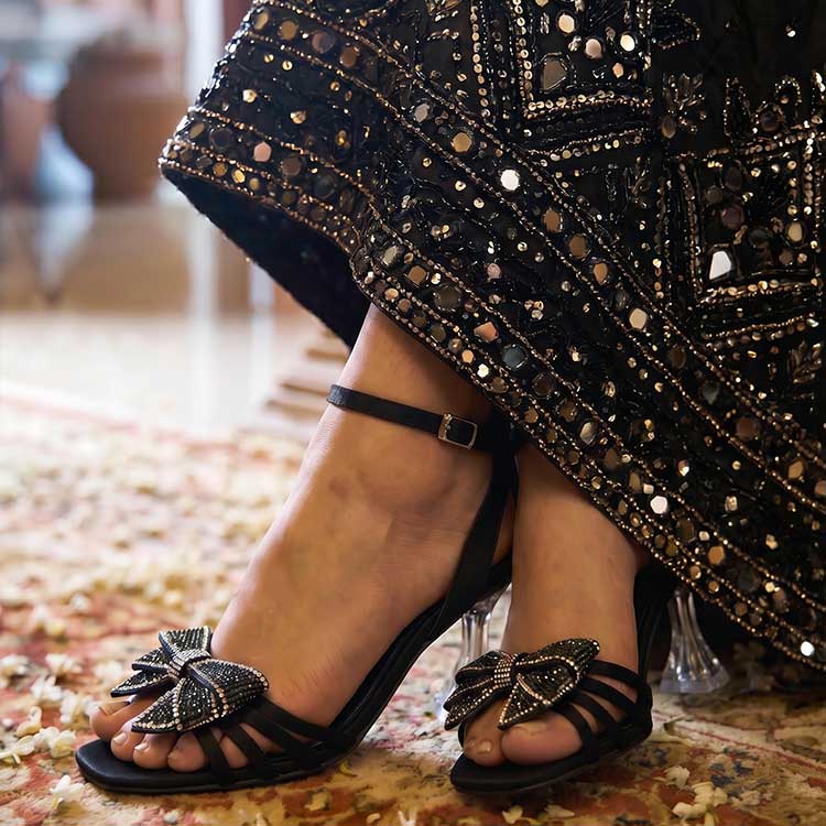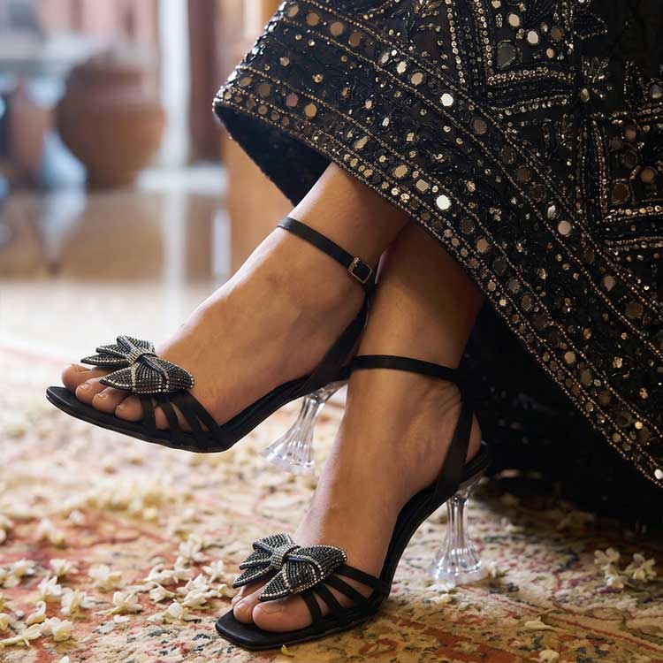 Sleek black heels crowned with a stunning crystal-encrusted bow, these glamorous beauties are the perfect blend of edgy and elegant — turning every step into a statement.