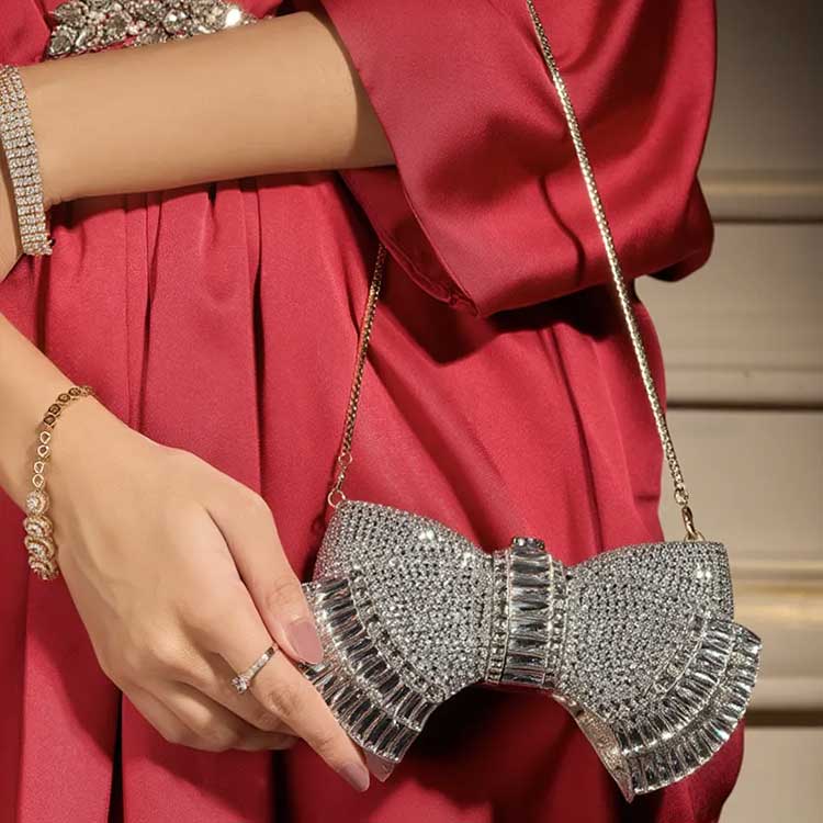 Bold and breathtaking, this crystal-studded bow clutch dazzles with rows of shimmering stones and sculpted brilliance. Designed to catch every light and every gaze, it’s the ultimate statement piece for evenings, weddings, and glamorous celebrations. Radiant, dramatic, and undeniably show-stopping.
