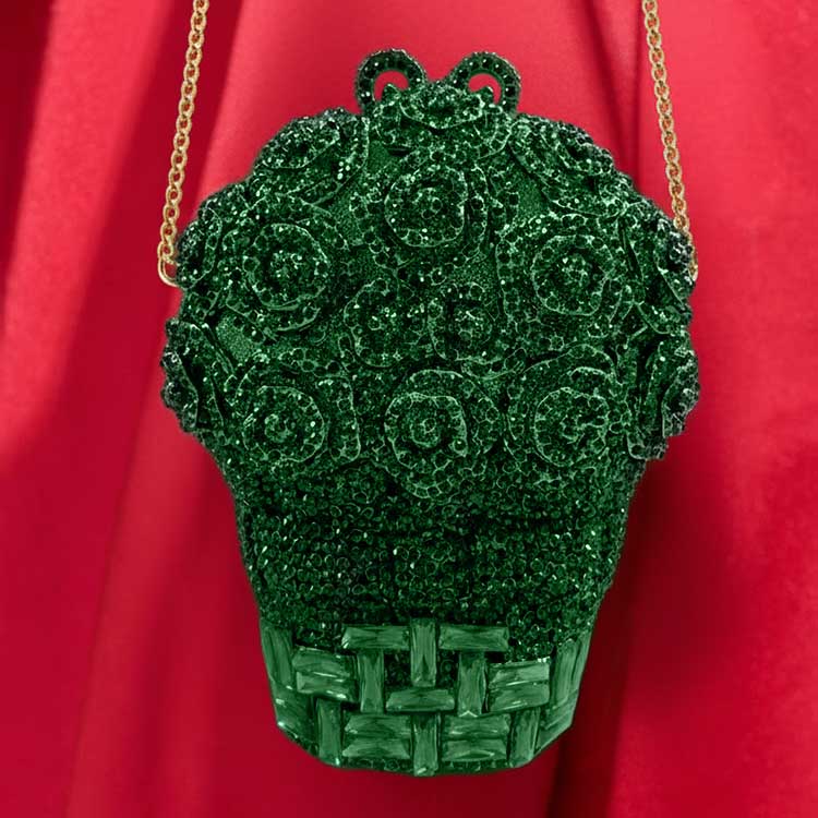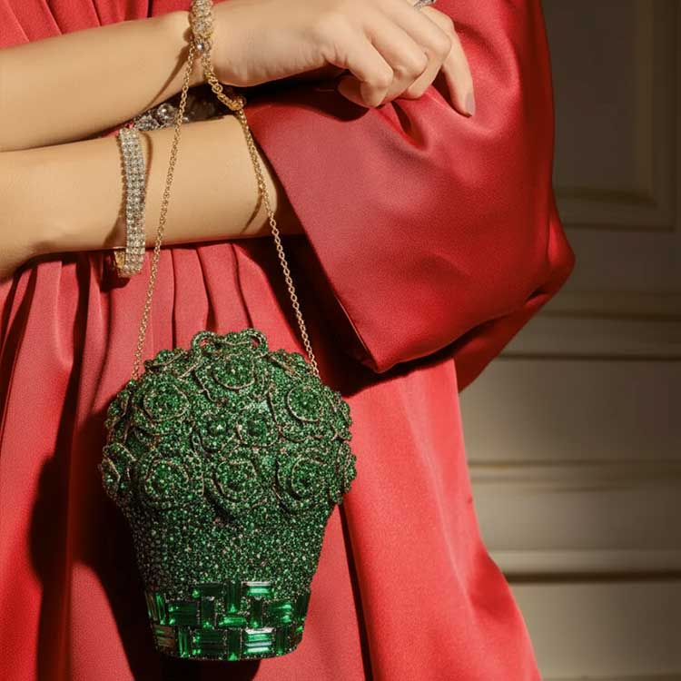 Bold and mesmerizing, this emerald crystal clutch is adorned with intricate rose patterns and shimmering embellishments that radiate luxury. Designed to captivate from every angle, it’s the perfect statement piece for weddings, soirées, and glamorous evenings. Regal, radiant, and truly unforgettable.