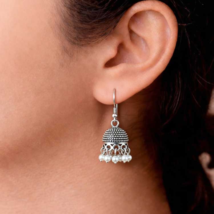 Charming and graceful, these silver-toned jhumka earrings feature finely beaded domes finished with a delicate fringe of pearl drops. Designed to move beautifully with every step, they add a soft traditional sparkle to any festive or ethnic look. Elegant, classic, and effortlessly radiant.