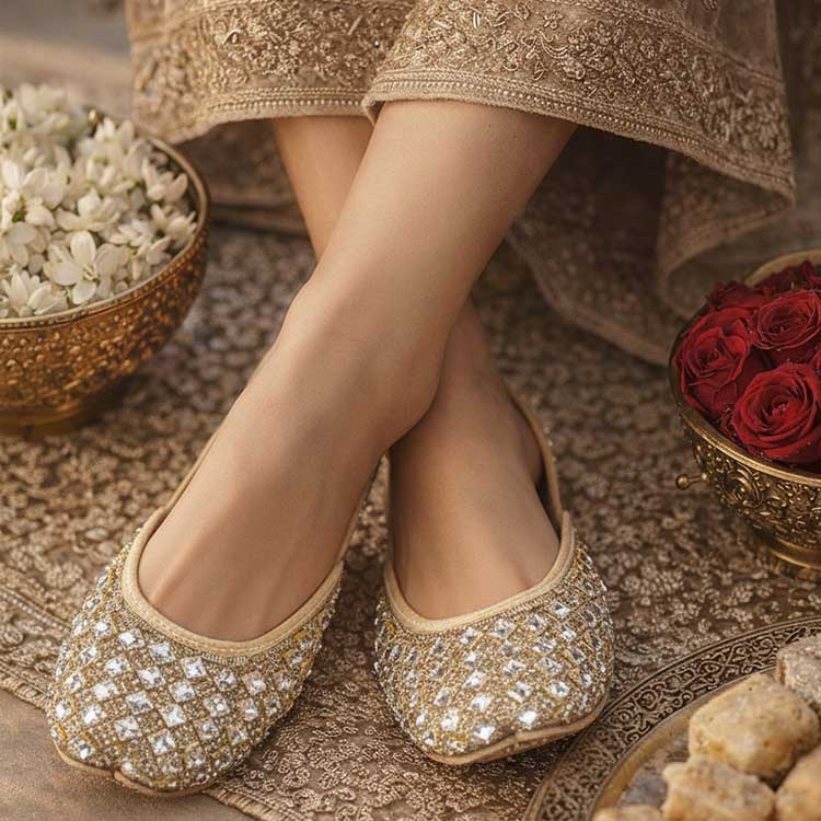 Beautifully crafted khussas embellished with vibrant multi silver stones and intricate detailing. Designed for elegance and comfort, these statement flats add a festive, regal touch to traditional and formal looks.