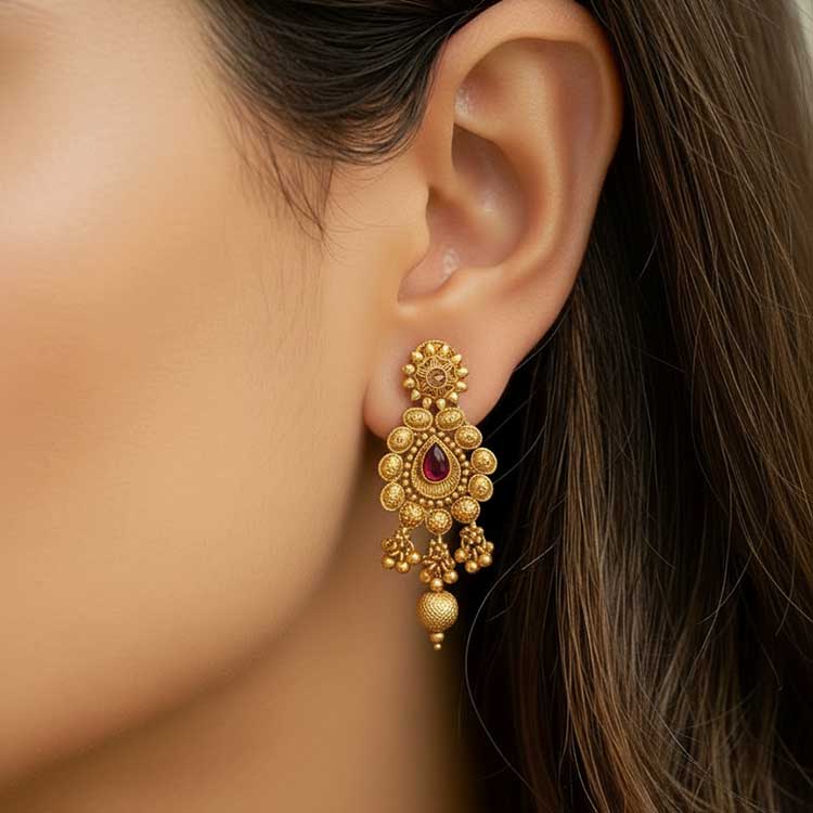 A complete traditional jewellery set featuring an elegant gold-toned necklace paired with matching earrings and a coordinating bindiya. Adorned with intricate detailing and rich ruby-toned accents, it’s designed to add festive charm and graceful elegance. Perfect for weddings, mehndi, and celebratory occasions.