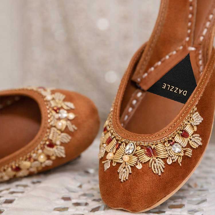 Warm and radiant, this rust-toned khussa is adorned with delicate floral embellishments and soft pearl accents for a graceful festive touch. Crafted for comfort with timeless traditional charm, it’s perfect for weddings, celebrations, and elegant ethnic looks. Feminine, vibrant, and effortlessly beautiful.