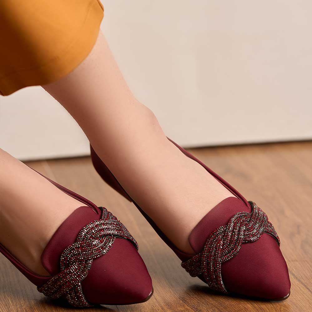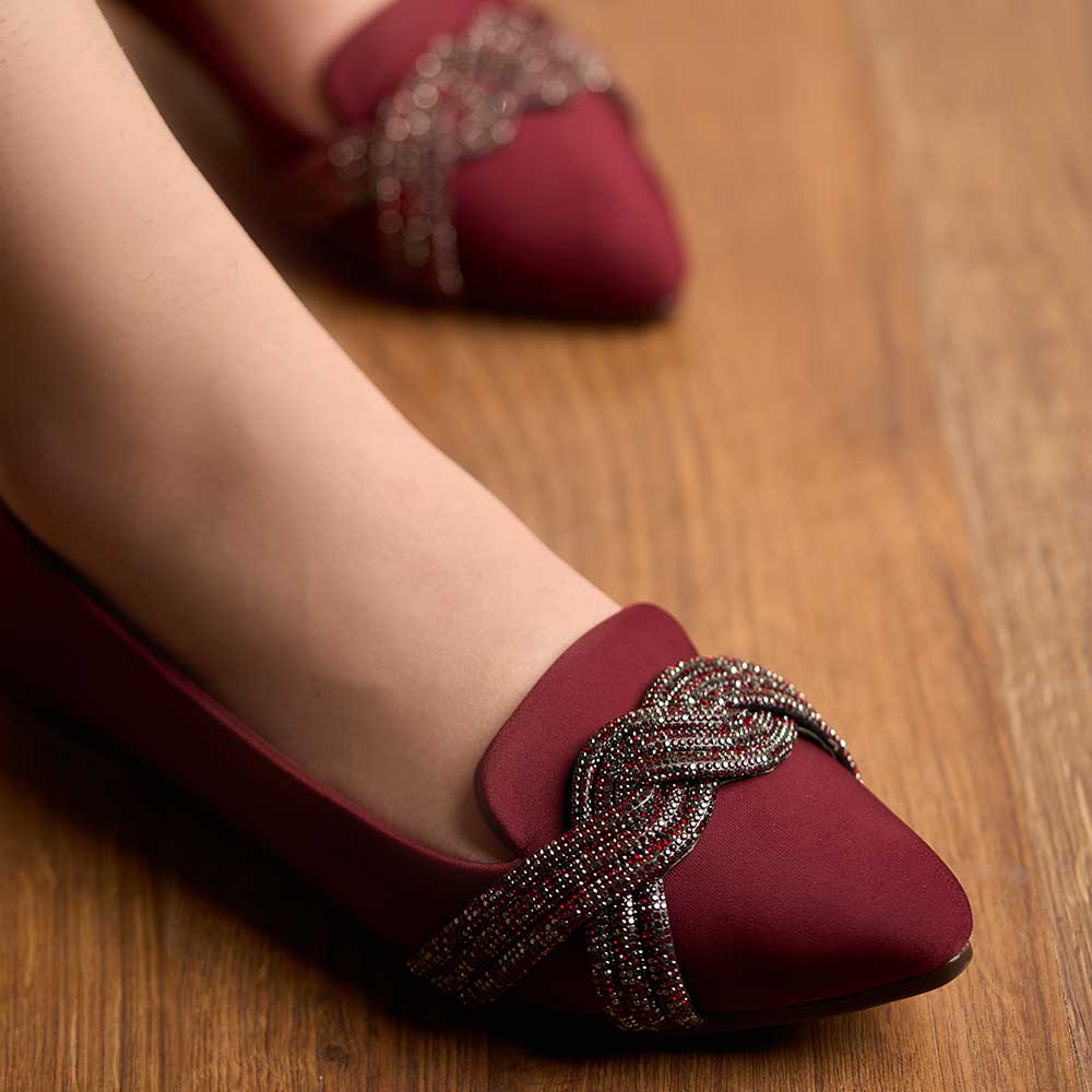 Step into refined elegance with these rich maroon flats, highlighted by a beautifully braided beaded embellishment. The pointed silhouette offers a sleek, polished look, while the cushioned interior ensures effortless comfort. Perfect for festive outings, formal wear, or elevating everyday style.