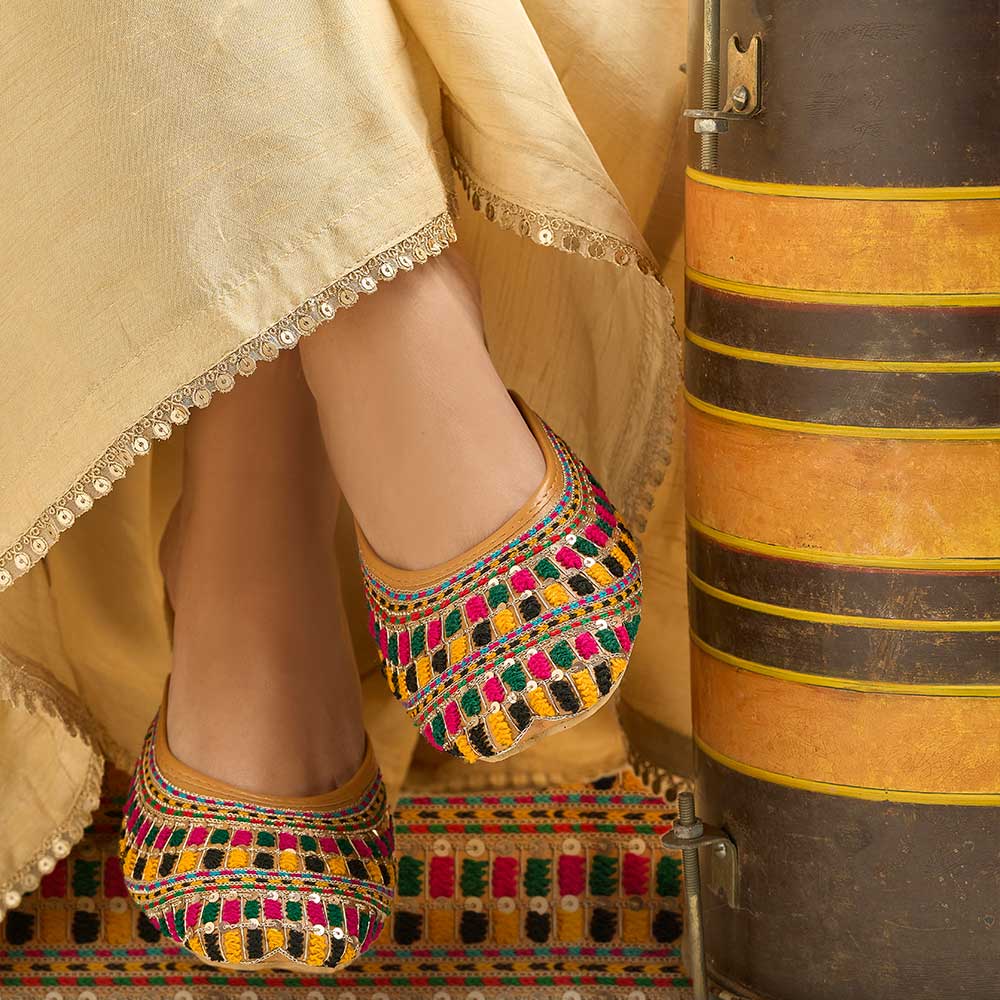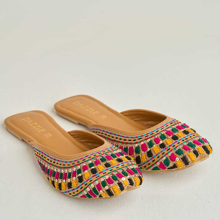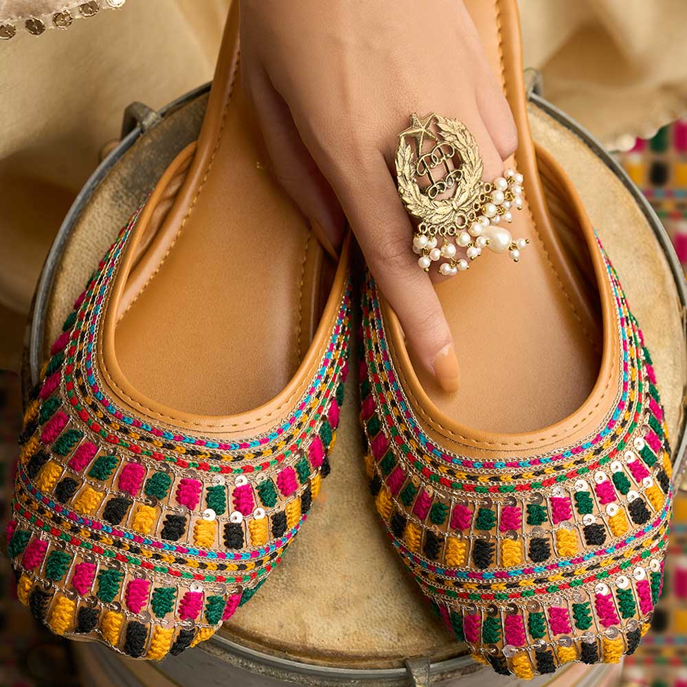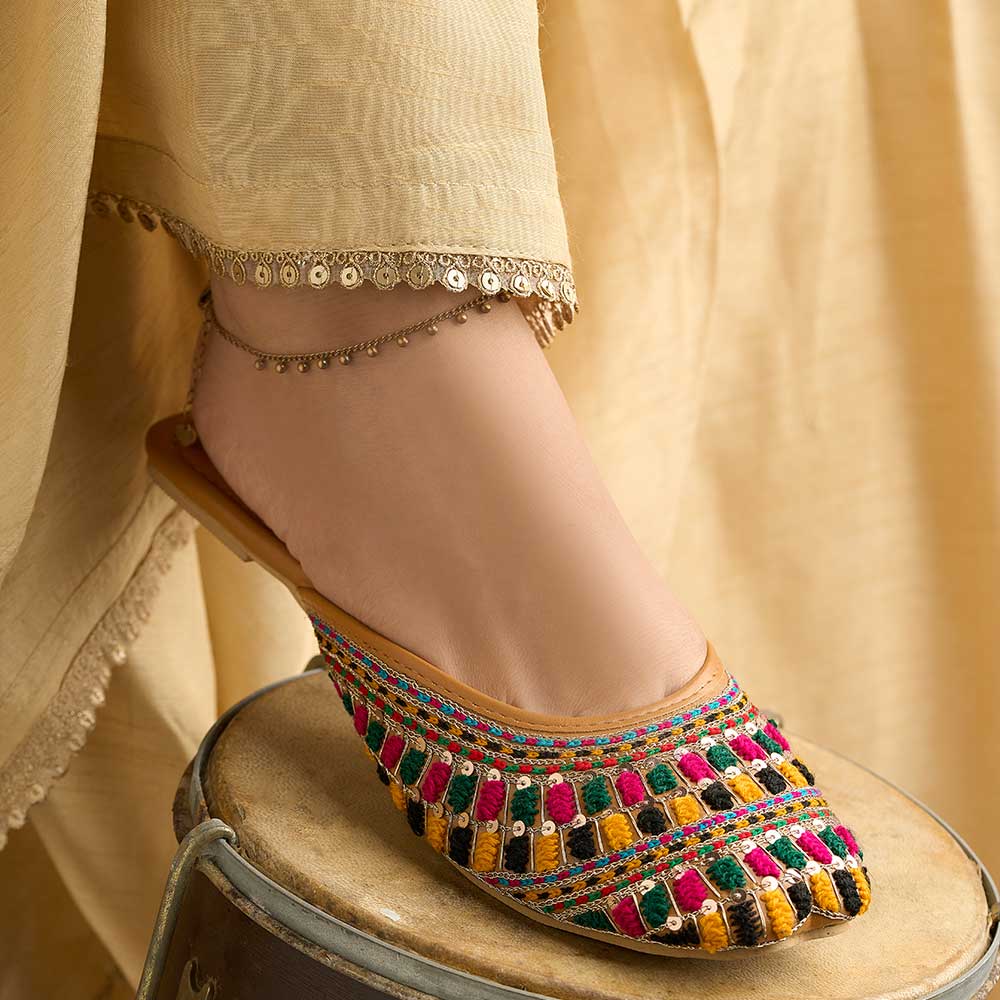 Brighten your step with the eye-catching Natalia khussa, featuring a vibrant multi-head embroidered upper. These khussa are designed for all-day wear, finished with a faux leather lining and a non-slip sole. Perfect for formal wear.
