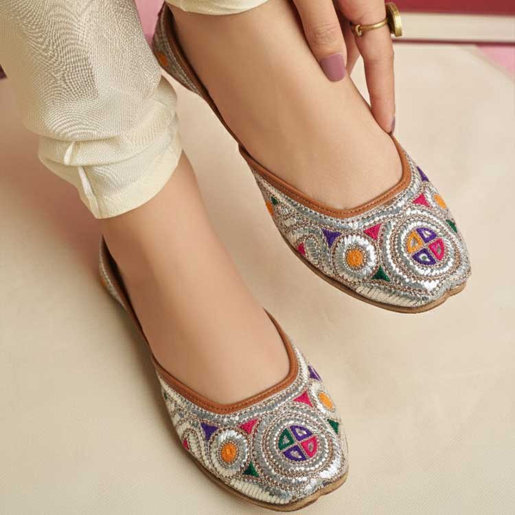 Crafted on rich brown leather, “Raheel” stands out with bold handcrafted motifs in pink, green, orange, and purple. The detailed silver work gives it a regal and artisanal touch.