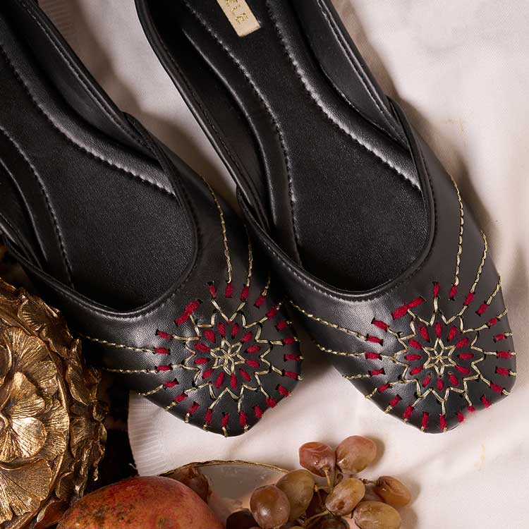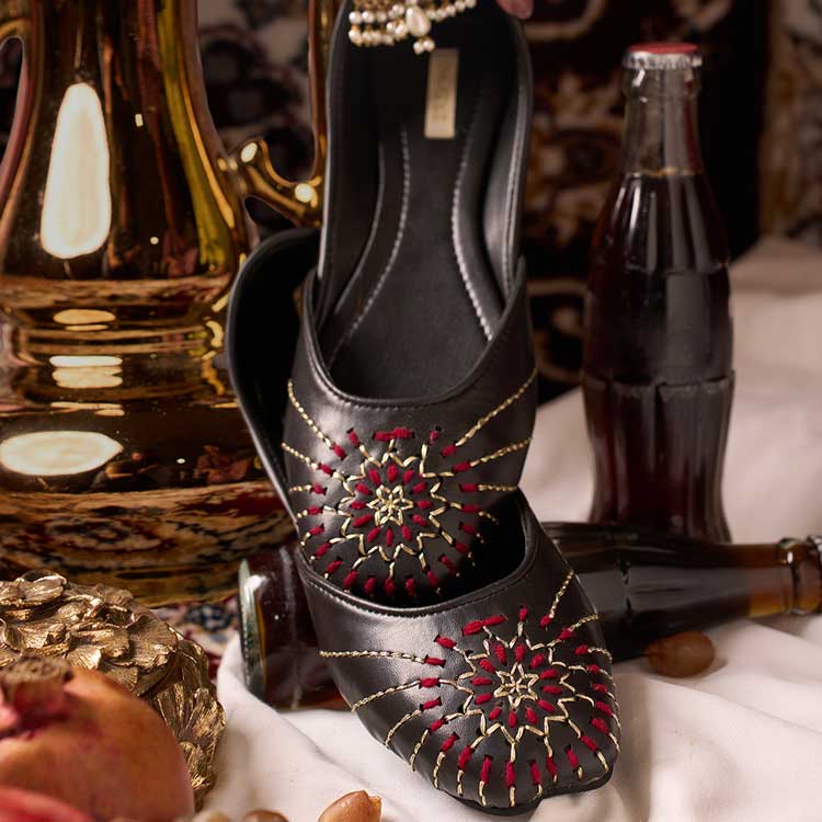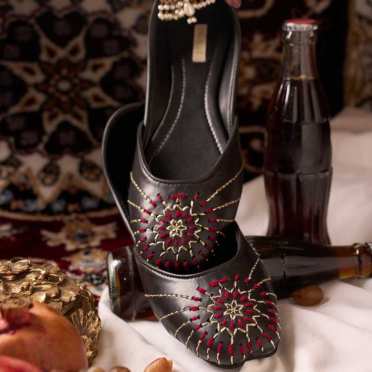Our “Rawaangi” Khussa classic beauty will elevate your look. A mainstay for any fashion-forward person, the traditional black leather is complemented by intricate laser-cut embellishments. This khussa elevates any ensemble, whether it's worn to a formal function or a laid-back day out.