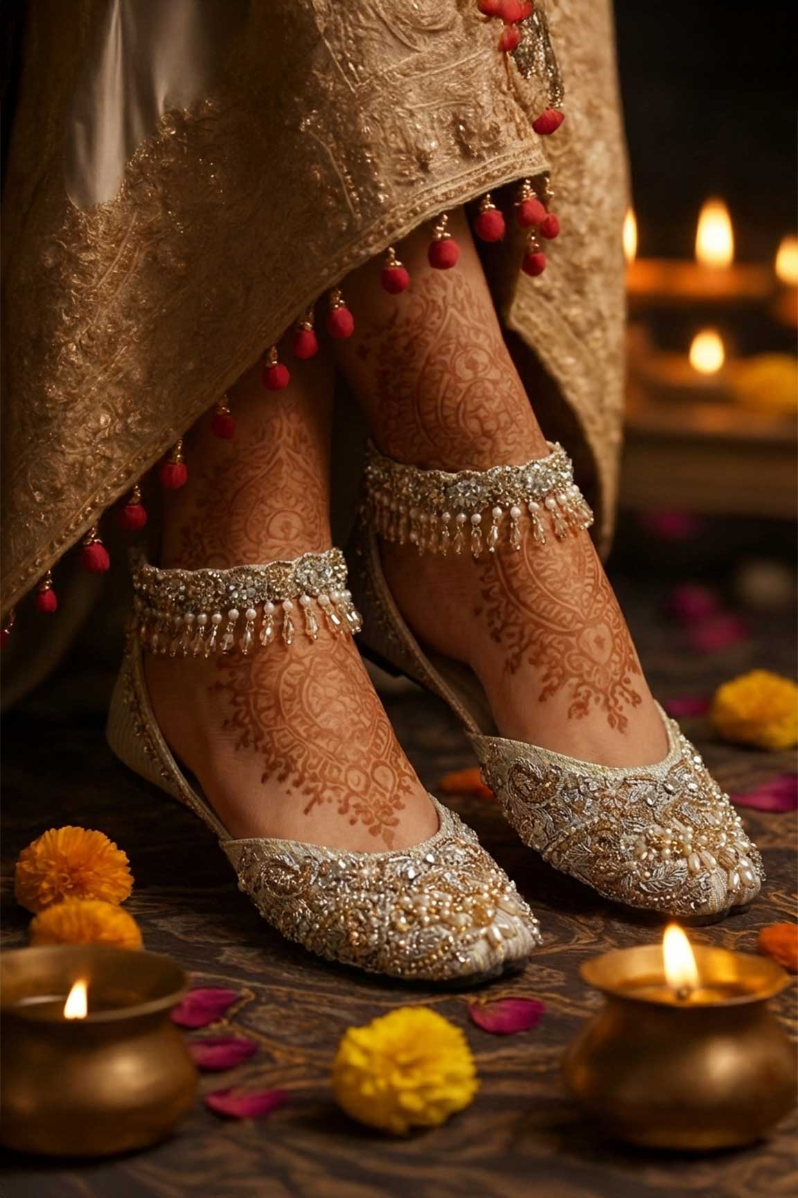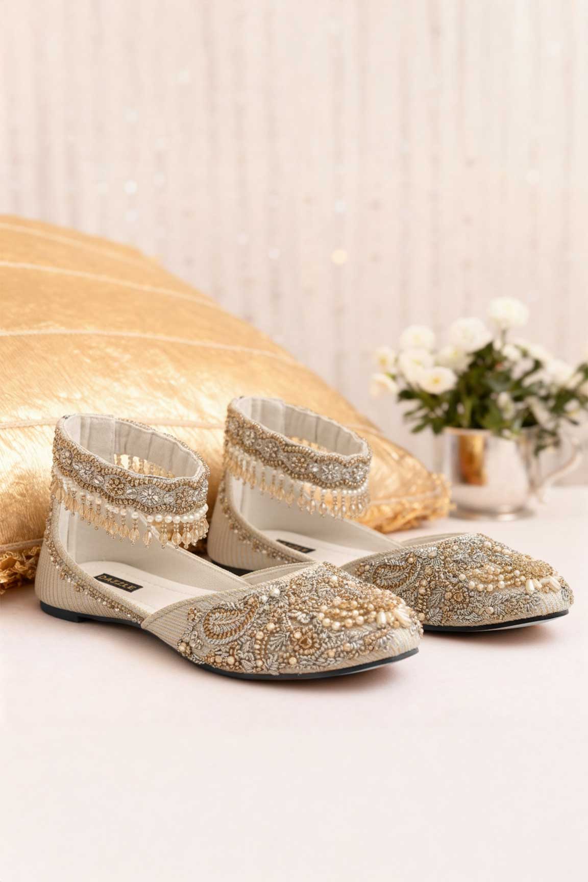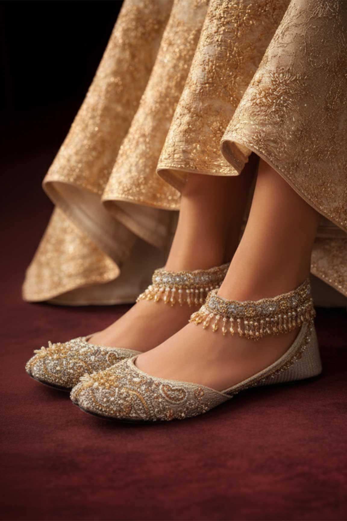 A moonlit dream brought to life, “Chaand Mahal” enchants with silver hues, delicate pearls, and shimmering gold embellishments. Designed to glow with every step, this ethereal pair blends regal craftsmanship with soft romance. Perfect for brides and evenings where elegance feels almost celestial.