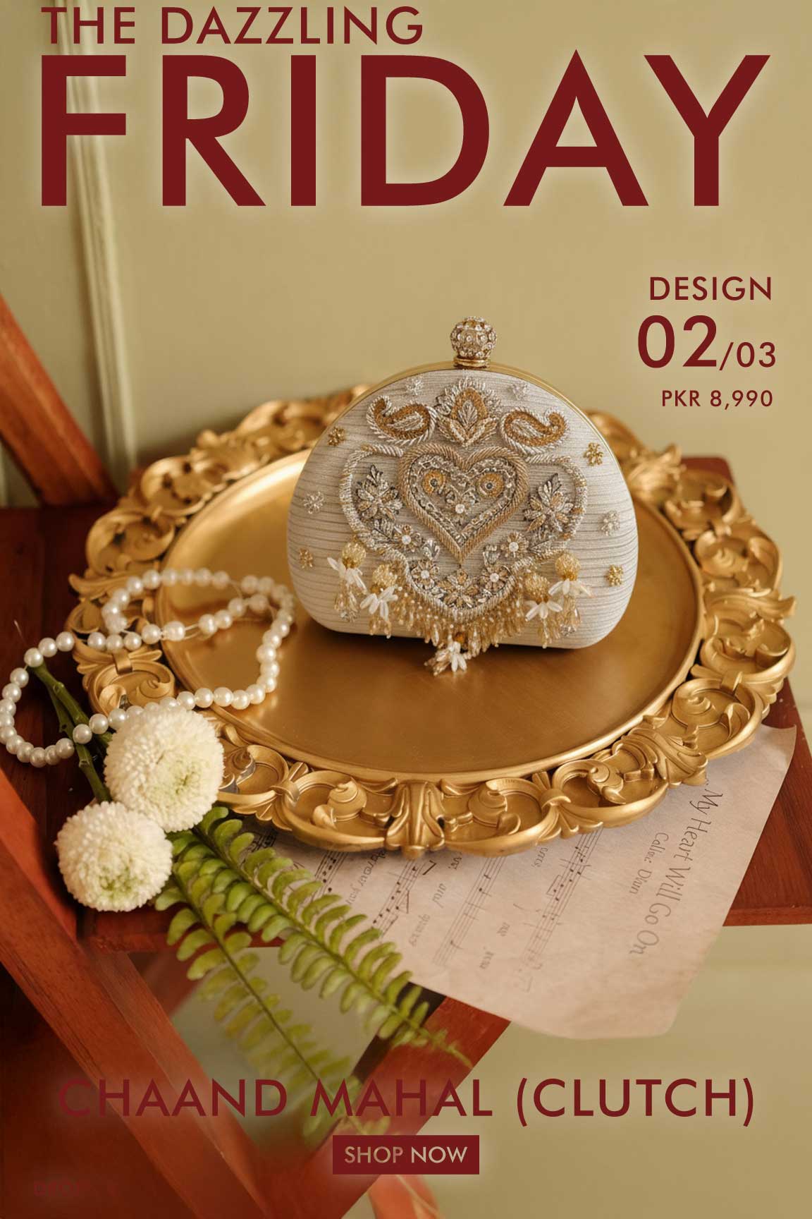 An ode to moonlit opulence, the “Chaand Mahal (Clutch)” dazzles in silver tones adorned with intricate gold embroidery, pearls, and crystal accents. Sculpted like a royal treasure, it adds a touch of celestial glamour to bridal and festive looks. A statement piece made for nights that deserve to shine.