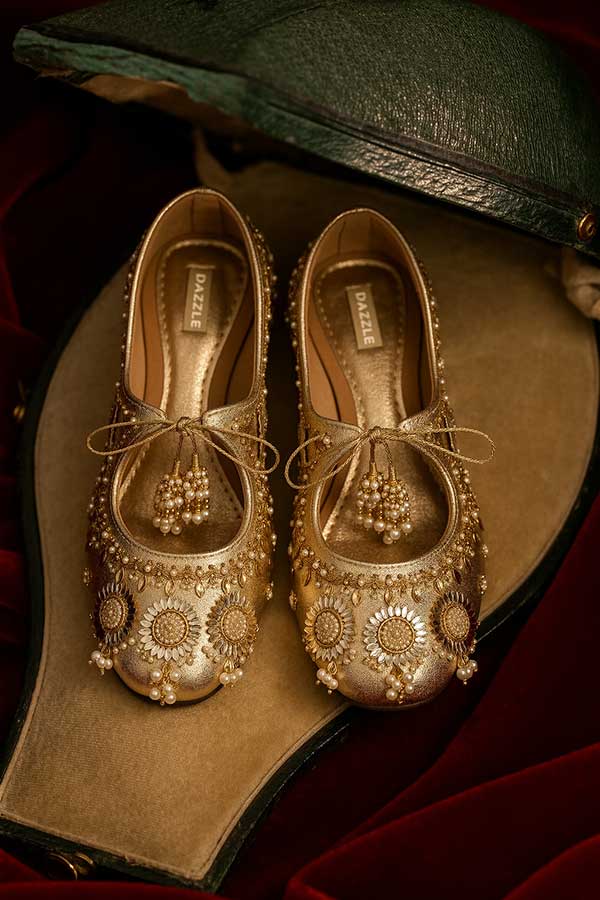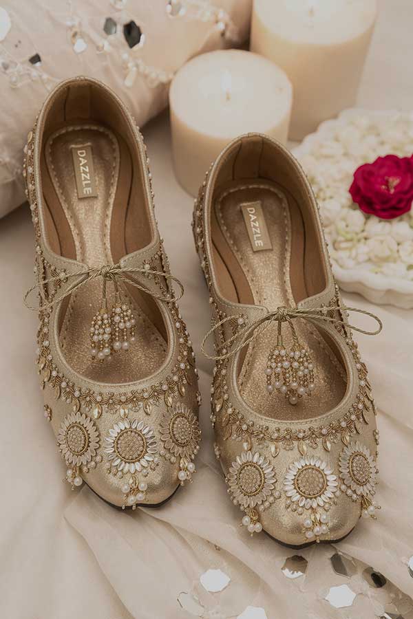 Delicate and dazzling, this embellished khussa features intricate beadwork, heavy brooches, shimmering accents, and elegant tassel ties for a regal finish. Designed to shine with every step, it’s perfect for weddings, festive occasions, and statement ethnic styling. Graceful, ornate, and truly captivating.