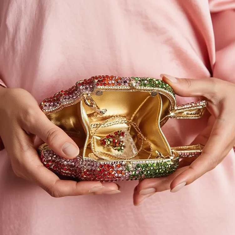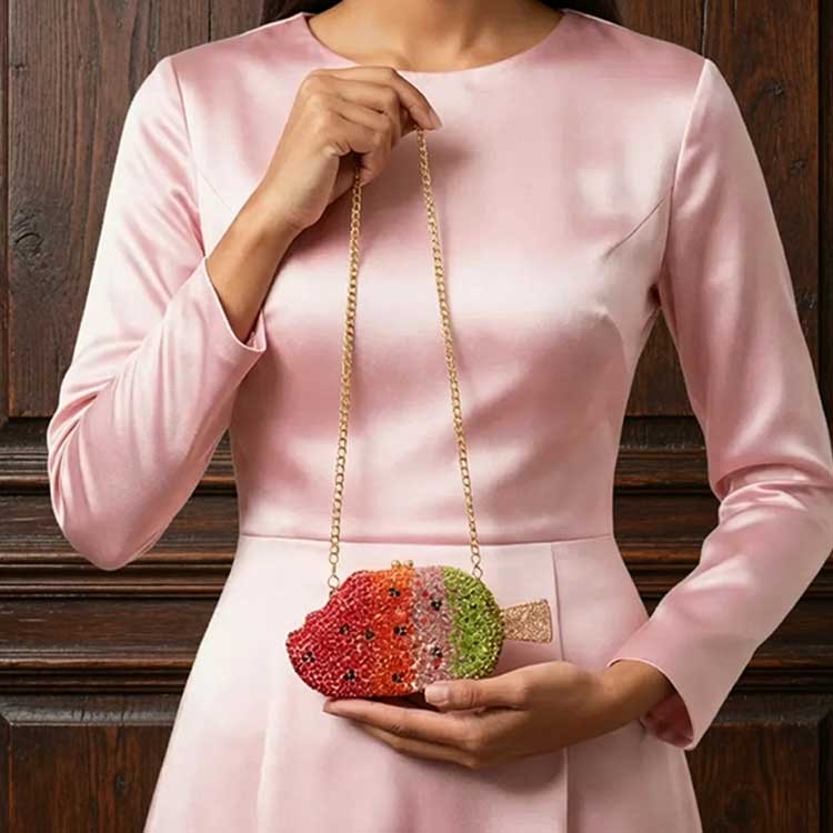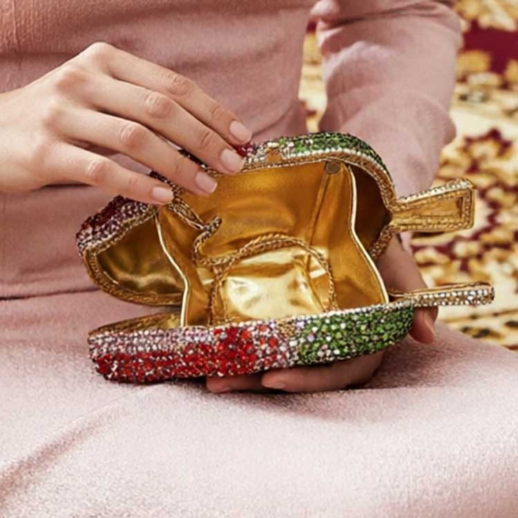 Playful and dazzling, this statement clutch sparkles with vibrant crystal embellishments in a bold blend of red and green. Designed to stand out, it features a unique silhouette that adds a fun yet glamorous touch to any look. Perfect for parties, festive occasions, and standout styling.