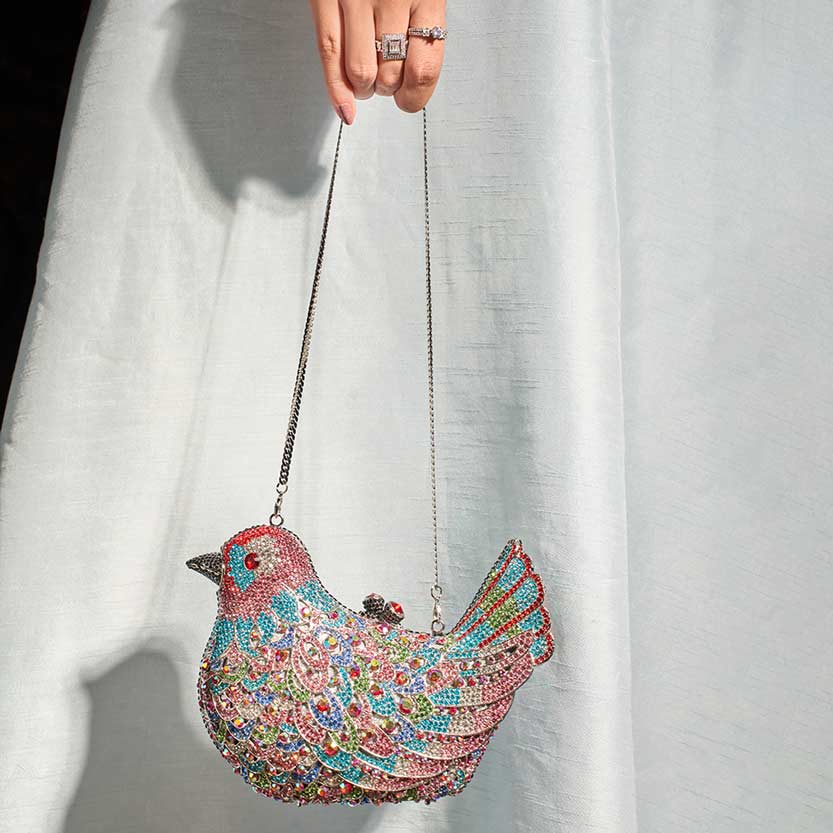 Starling a clutch that captures elegance with a vibrant twist. Its bird-inspired metal frame sparkles with multicolored rhinestones, creating a dazzling statement. The sleek structured silhouette offers room for your essentials, while the silver chain strap adds versatility and charm to your look.