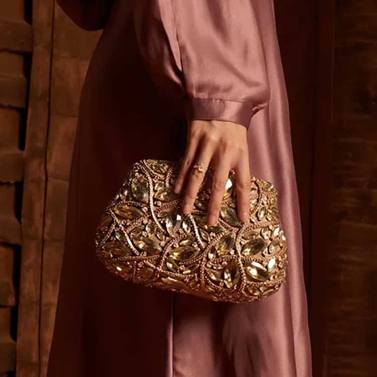 Luxurious and radiant, this statement clutch is adorned with intricate crystal embellishments arranged in a striking floral pattern. Designed to shimmer with every movement, it exudes elegance and high-glam appeal. Perfect for weddings, soirées, and evenings that call for standout sparkle.